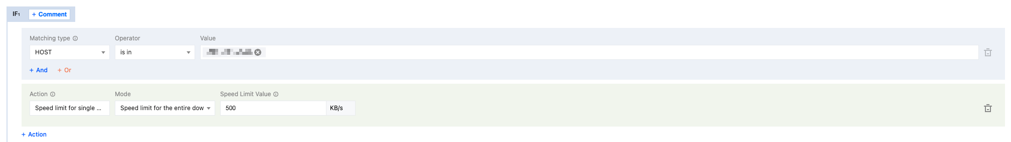 If you want all requests to be limited to a download speed of 500 KB/s for the domain www.example.com under the site example.com, refer to the following steps: