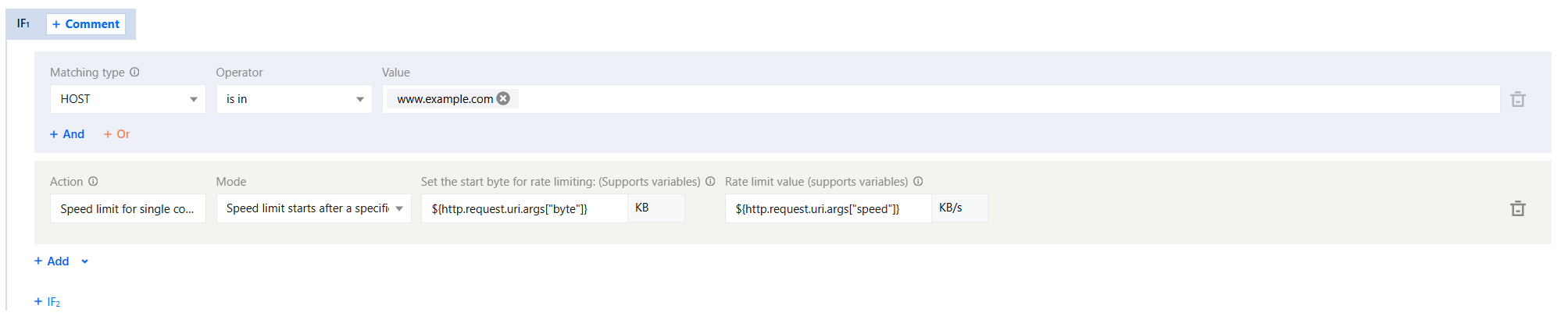 If you want the domain www.example.com under the site example.com to dynamically throttle based on the values of the query parameters in the request URL, where speed is the throttling value and byte is the size at which throttling begins, refer to the following steps: