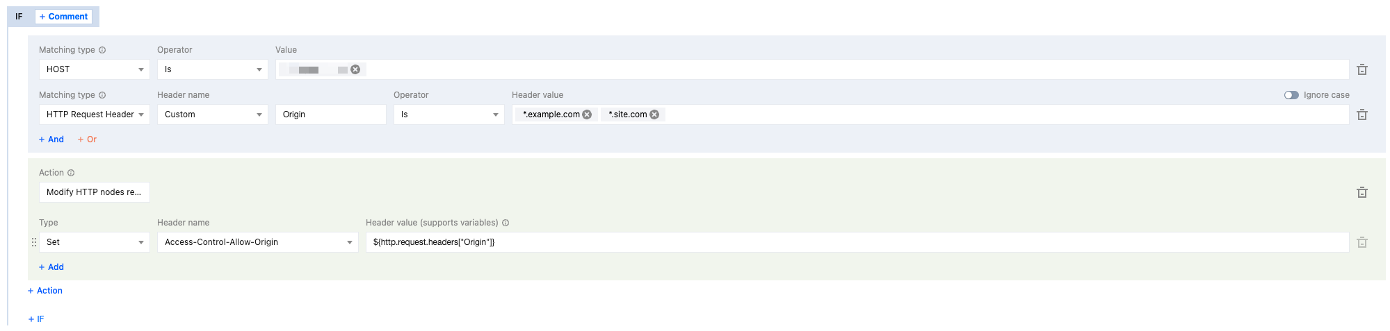 Access-Control-Allow-Origin | Values support constants and variables. Among them: Constant: support input *, multiple domain names, IPs, or a mix of domain names and IPs (must contain http:// or https://, such as http://test.com,http://1.1.1.1. Multi-values can be separated by English commas, and up to 1000 characters can be entered. Variable: Match the required cross-origin originating domain via the Origin request header, using the header value ${http.request.headers["Origin"]}. |