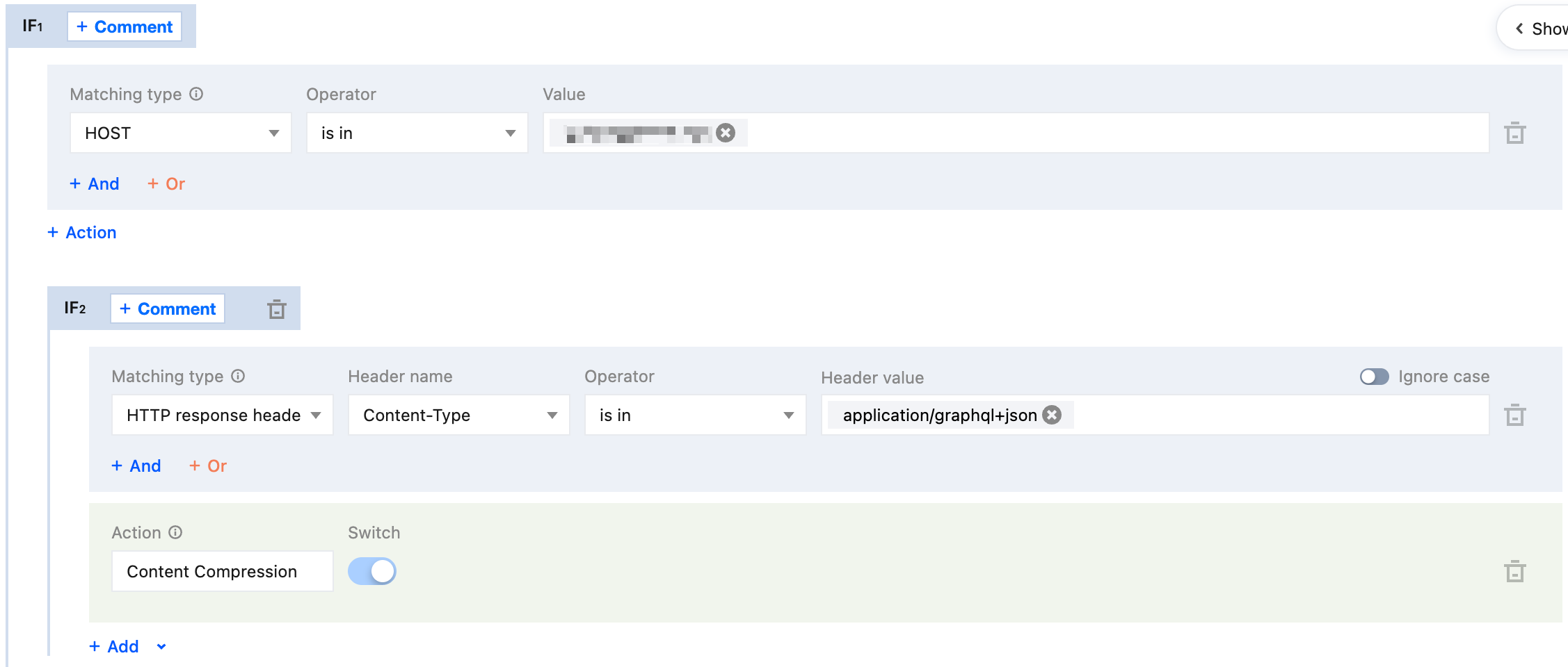 4. On the Rule Editing Page, set the outer IF match type selection to HOST equal www.example.com, and simultaneously set the inner-layer IF HTTP response header named Content-Type with value is in application/graphql+json.