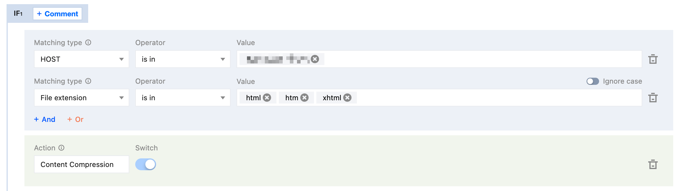Content compression supports match conditions such as HOST, file suffix, and HTTP response header Content-Type. When using HTTP response header Content-Type as a match condition, list the Content-Type in one IF rule. If multiple IF rules are configured, the bottom IF rule will override the ones above, meaning only the bottom IF rule takes effect.