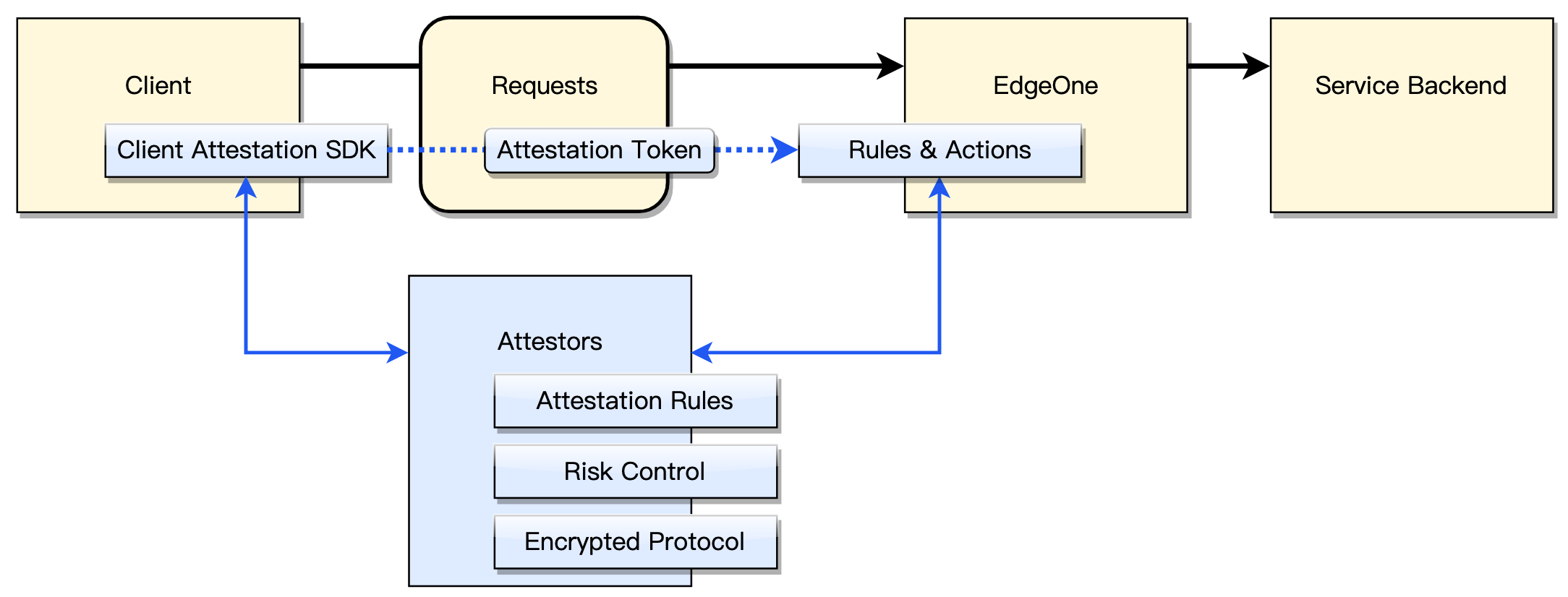 Client attestation identifies legitimate clients through endpoint security mechanisms, while verifying requests carrying identification info to detect abnormal sources, thereby defending against malicious crawlers and automation tool attacks. After enabling Client attestation, EdgeOne requires clients to complete additional verification (such as graphic Captcha) to obtain valid credentials. Clients carry these credentials in requests to certify they originate from trustworthy real users. This mechanism effectively distinguishes legitimate users from malicious automated processes, protecting backend service API security.