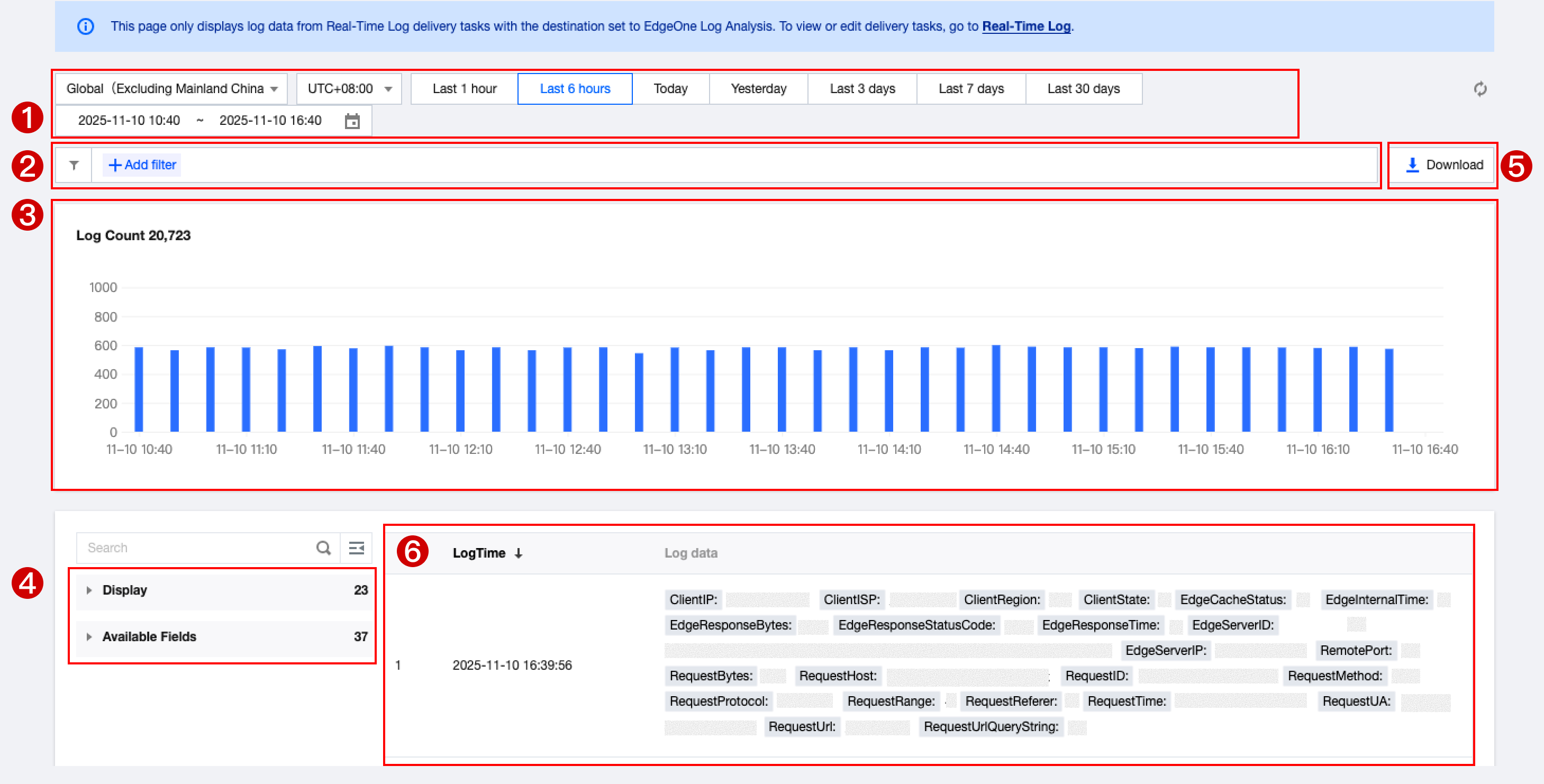 Log Analysis (Beta) is a native data visualization feature in EdgeOne designed for log query and analysis. It provides real-time visibility into website access patterns, security events, and performance metrics. By delivering EdgeOne logs to Log Analysis with low latency, logs can be queried, analyzed, and downloaded directly in the console, without the need for additional configuration or integration with external log services or third-party analytics tools.