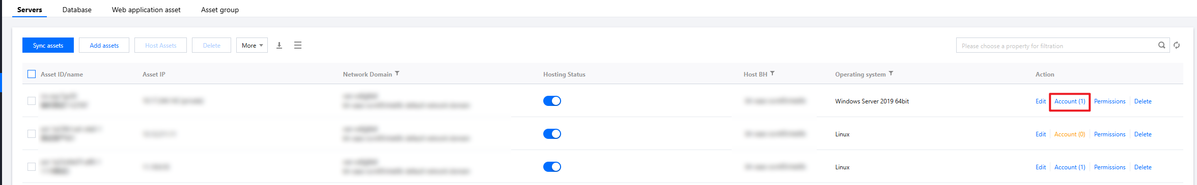 3. On the Host Assets page, select the target asset and click Account. 4. In the Account Management window, click Add managed account.