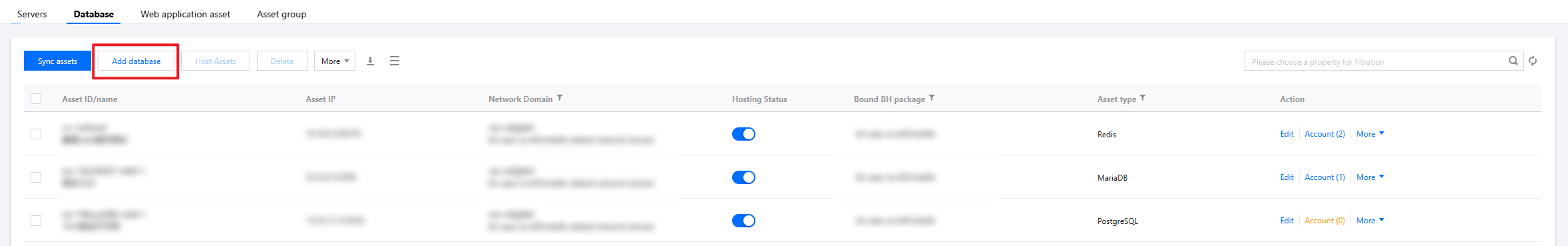 6. After the database is created, on the Database page, select the corresponding database and click Host Assets.