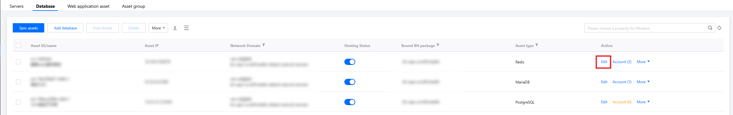 3. On the Database page, select the target asset and click Edit. 4. In the asset information window, you can modify the related asset information.