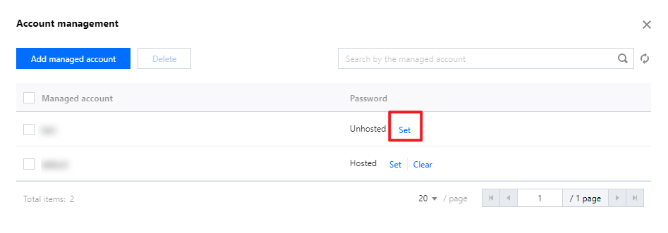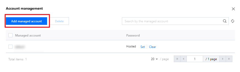 3. On the Database page, select the target asset, then click Account. 4. In the Account Management window, click Add managed account, and the Add Asset Account window will pop up.