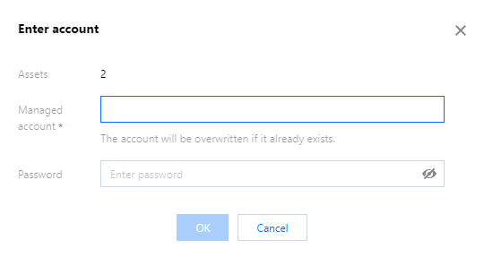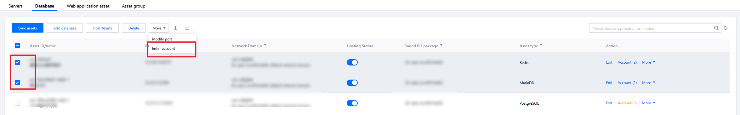 3. On the Database page, select the database where you want to input accounts, then click More > Enter account. 4. In the account input window, you need to configure the following information: