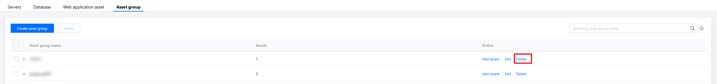 3. On the Asset group page, select the target asset group and click Delete. 4. In the deletion confirmation popup, click OK to successfully delete the asset group.