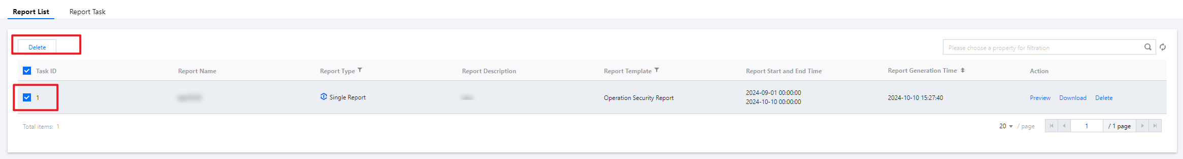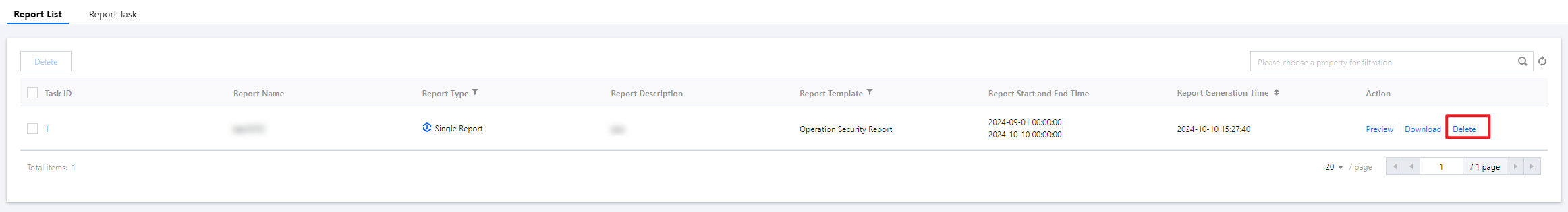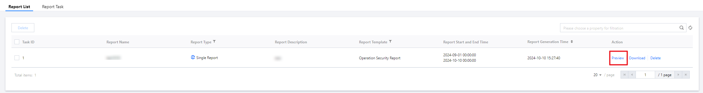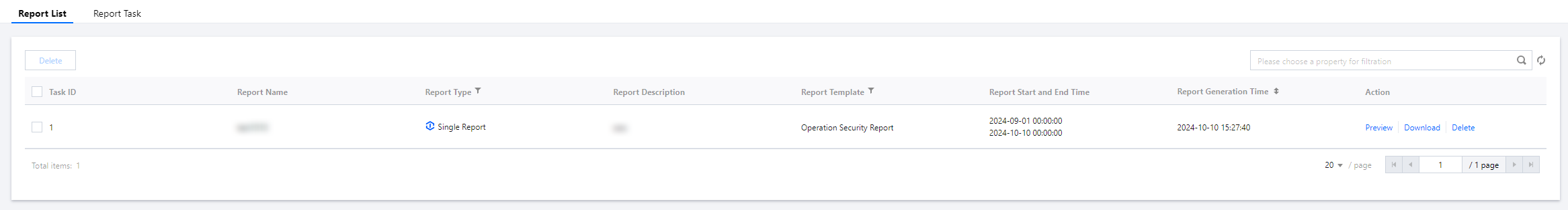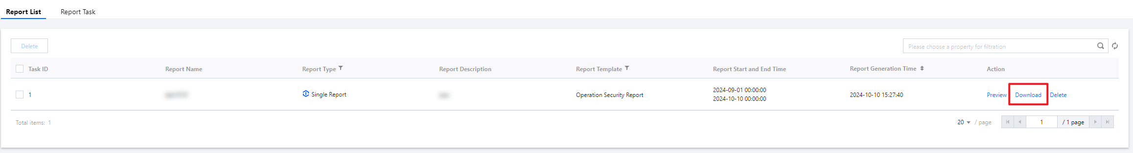 Once a report task is completed, the generated report will appear in the report list. You can preview, download, or delete the report from the list.