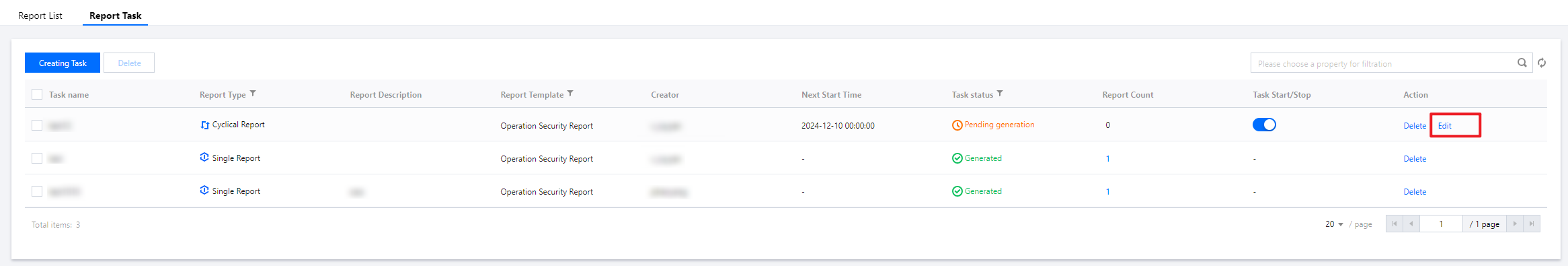 The report task list records all tasks you have created. You can switch the task status between start and stop, and also edit or delete tasks.