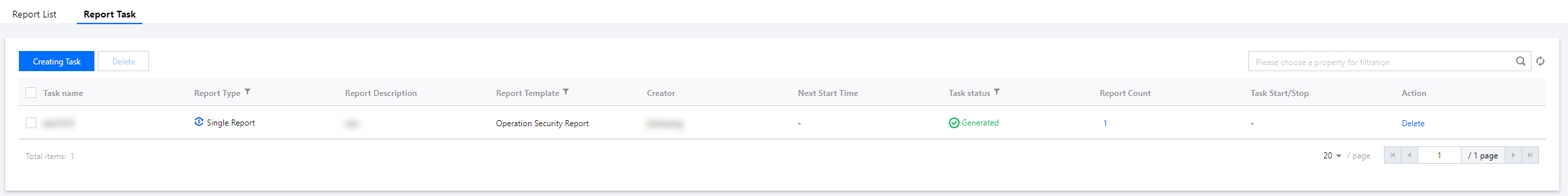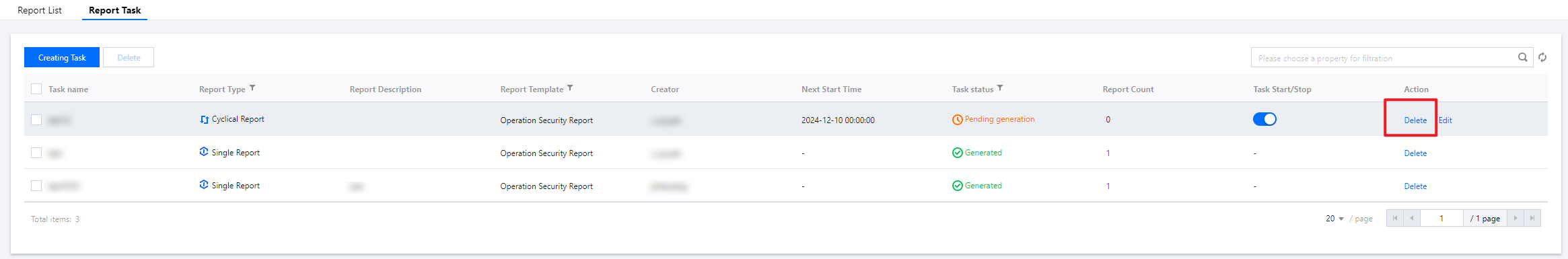 If you want to delete a report task, click Delete in the operation column of the corresponding task.