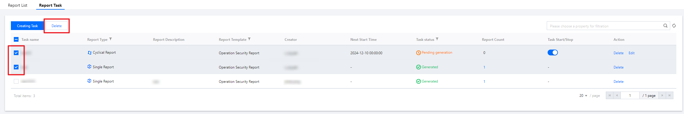 1. On the Audit Report > Report Task page, you can delete a task or multiple tasks.