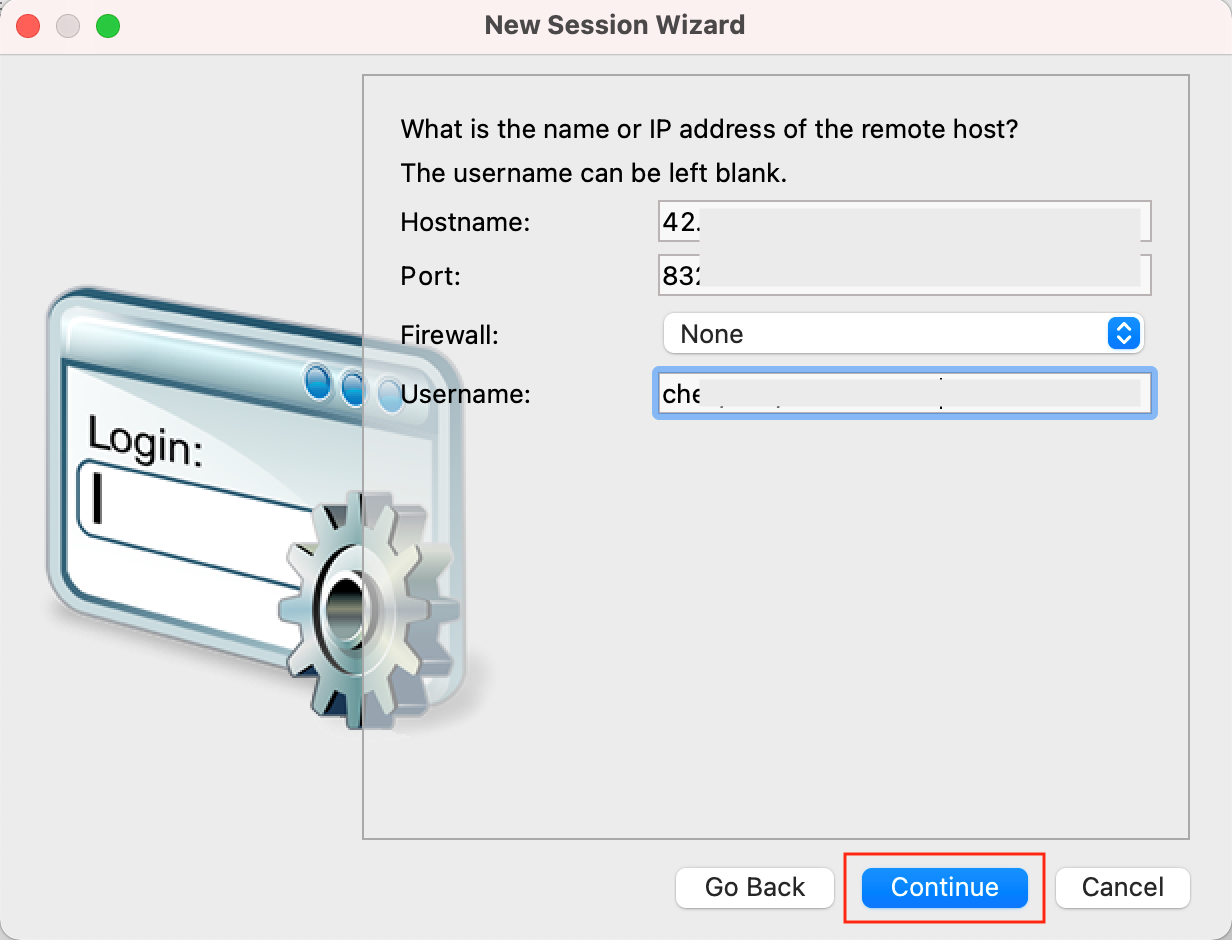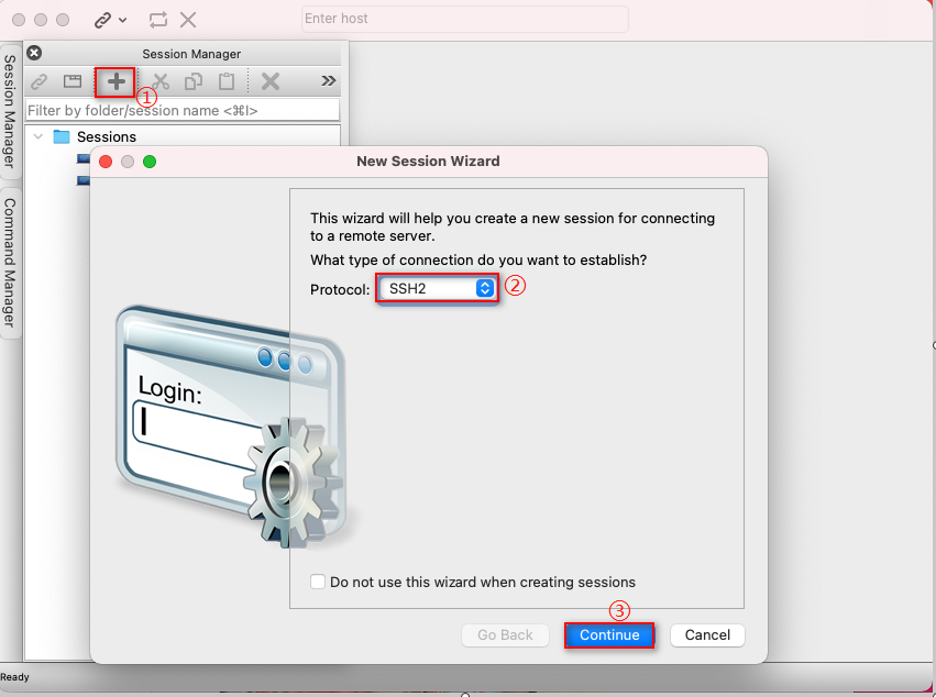 2. Click New Session to open the New Session Wizard window. Set Protocol to SSH2 and click Continue.