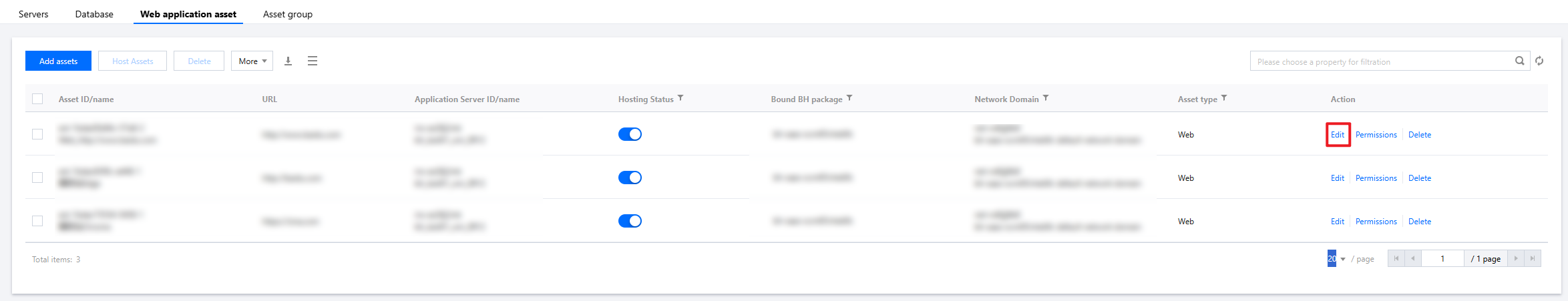 3. On the Web Application Asset page, select the application asset that needs to be edited and click Edit in the operation column. 4. In the editing window, you can modify the application server, application server account, URL, remote client, asset name, and asset group information in the asset information. Click Confirm to save.