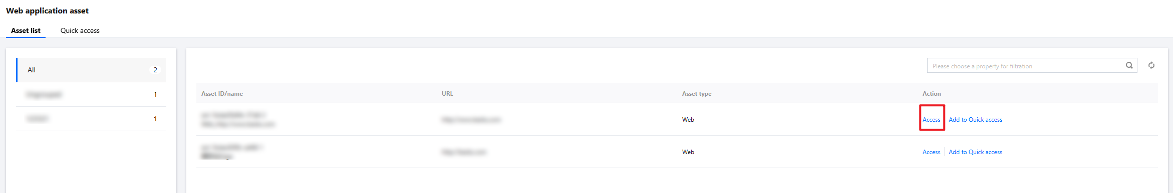 3. On the Web Application Asset List Page, click Access on the right of the corresponding web application, and an access window will pop up. 4. In the access pop-up window, click Access just.