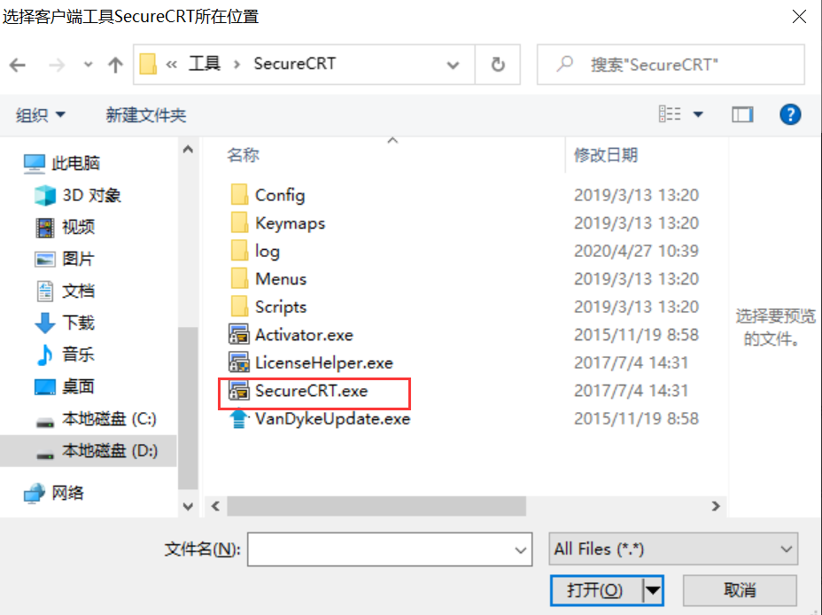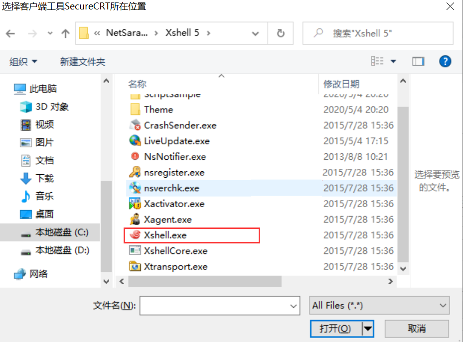 Although Xshell or SecureCRT has been installed, clicking to access Linux resources does not trigger the BHLoader plugin to launch the corresponding tool. Instead, the following file selection dialog box appears.