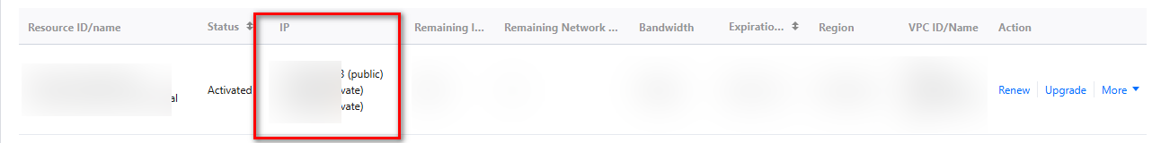 1. On the Activate Service page, view the private and public IP addresses of the BH that cannot access the target resource. Record the private IP address to add it to the inbound rules in [Step 5](#Step 5!0011237e8dc98411a0794ba6dddb9989).