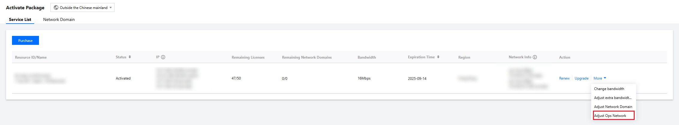 3. On the service list page, click More > Adjust Ops Network in the corresponding service operation bar.