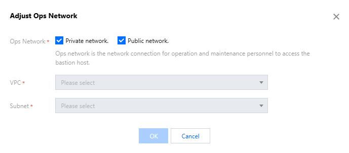 4. In the Adjust Ops Network window, select private network as the Ops method, and then select VPC and subnet, click OK.