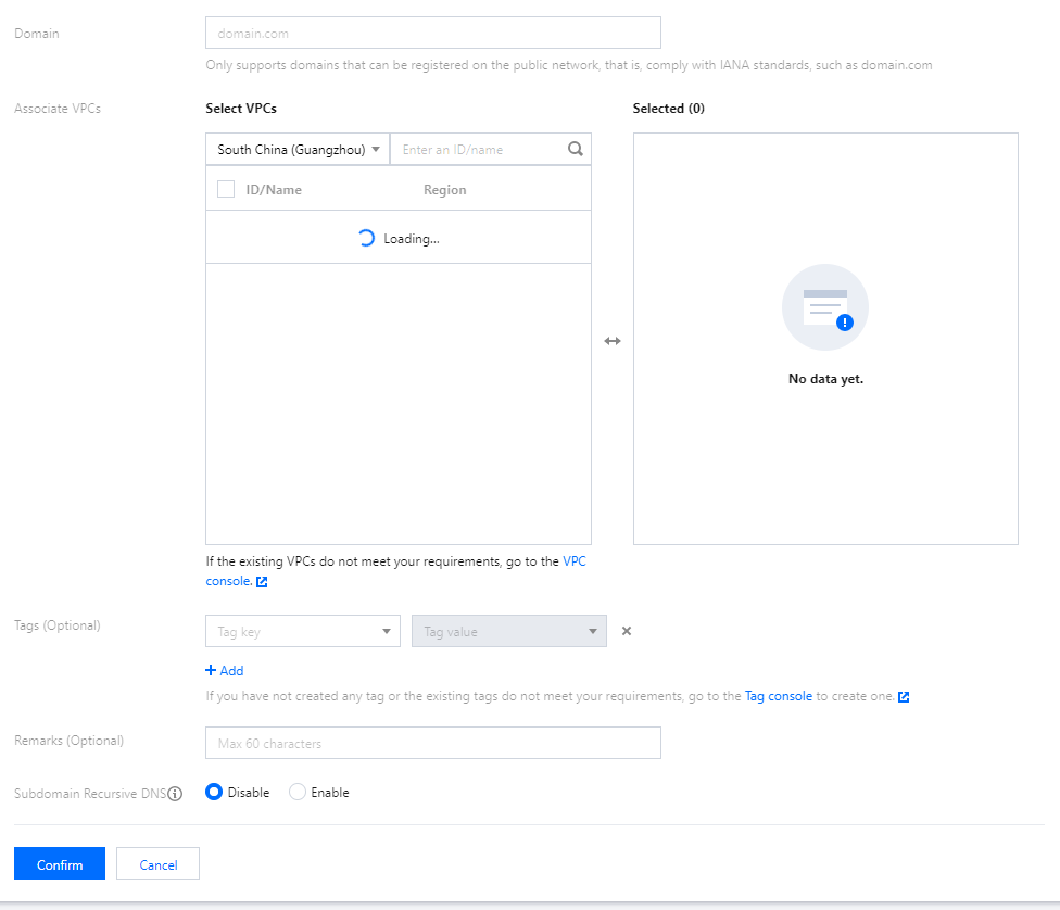 4. On the Create Private Domain webpage, fill in the relevant information for the private domain, then click Confirm.