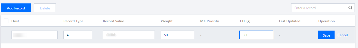 6. On the resolution record page, click Add Record, add the host and record value, then click Save once completed.