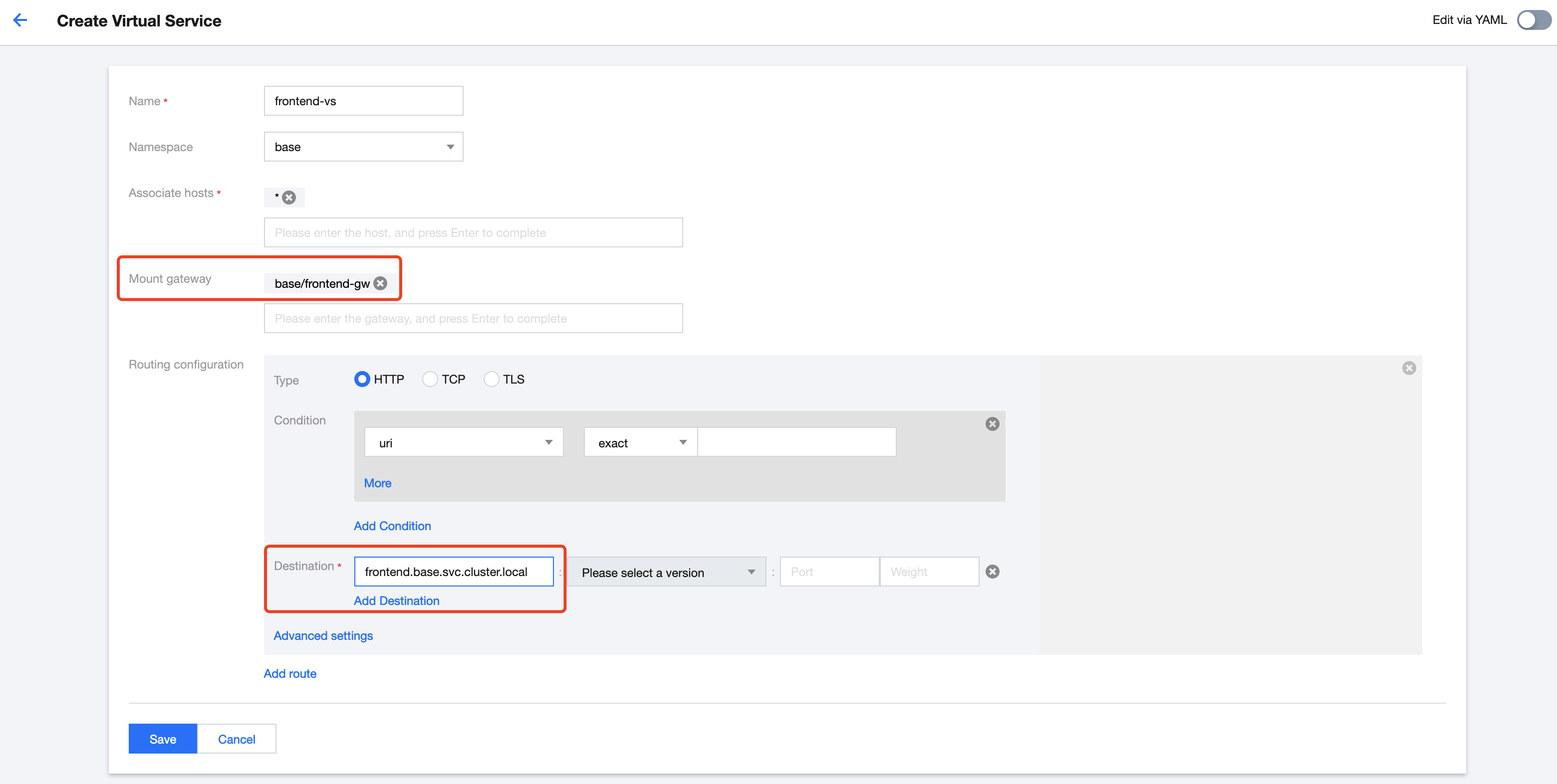 apiVersion: networking.istio.io/v1alpha3kind: VirtualServicemetadata:name: frontend-vsnamespace: basespec:hosts:- '*'gateways:- base/frontend-gw # VS 挂载的 Gateway 填写按照 {namespace}/{Gateway 名称}http:- route:- destination:host: frontend.base.svc.cluster.local # 路由目的地填写 frontend 服务的 host 全称