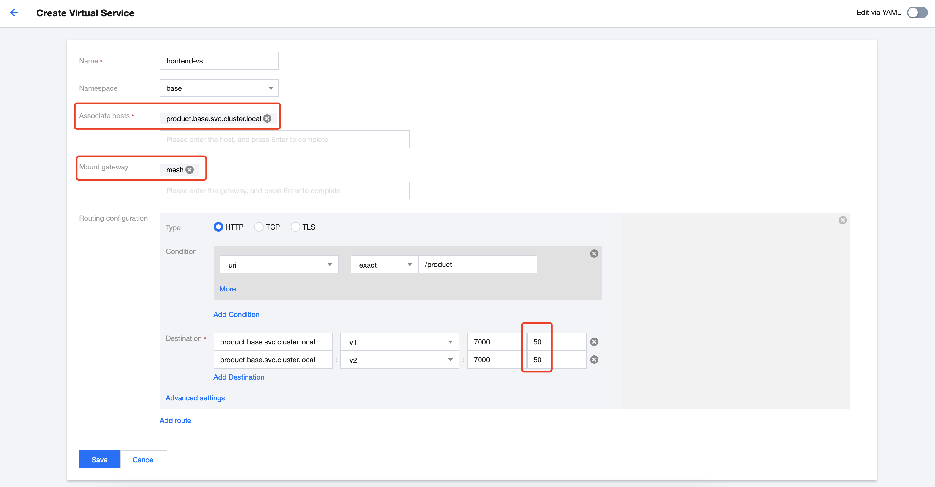 apiVersion: networking.istio.io/v1alpha3kind: VirtualServicemetadata:name: product-vsnamespace: basespec: # 缺省 gateway 参数,表示该路由配置应用于 mesh 内部 sidecar 的流量hosts:- "product.base.svc.cluster.local" # 匹配访问该 host 的流量http:- match:- uri:exact: /productroute:- destination: # 配置目的端及权重host: product.base.svc.cluster.localsubset: v1port:number: 7000weight: 50- destination:host: product.base.svc.cluster.localsubset: v2port:number: 7000weight: 50