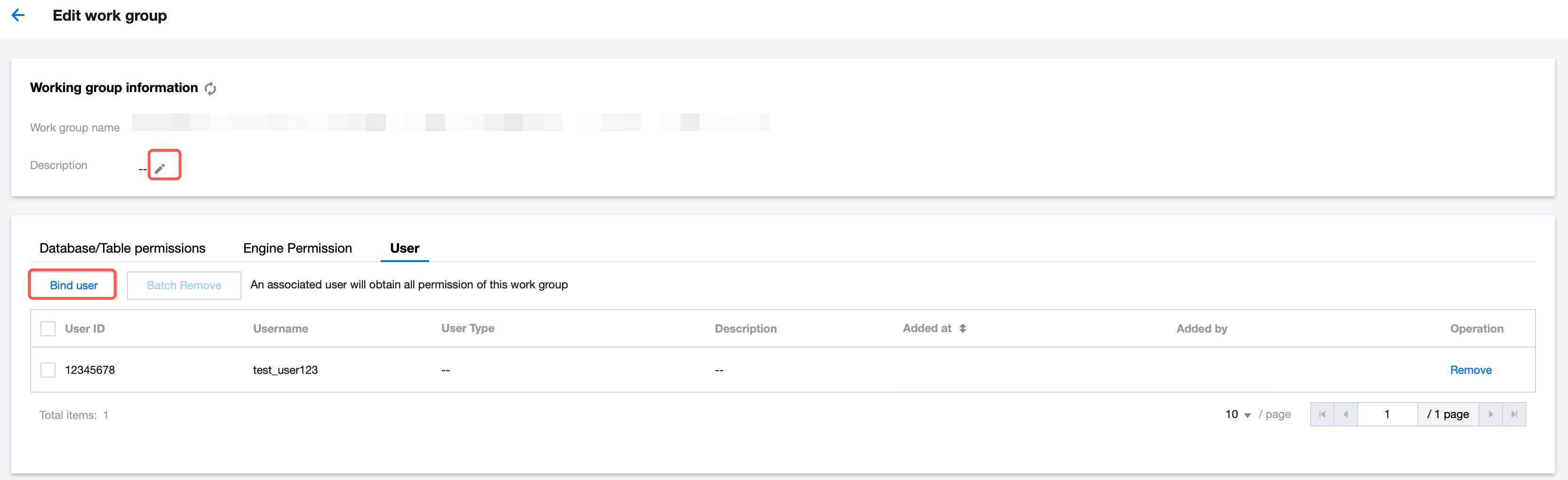 To edit the description, click . You can click Bind user to add Data Lake Compute users to the work group.