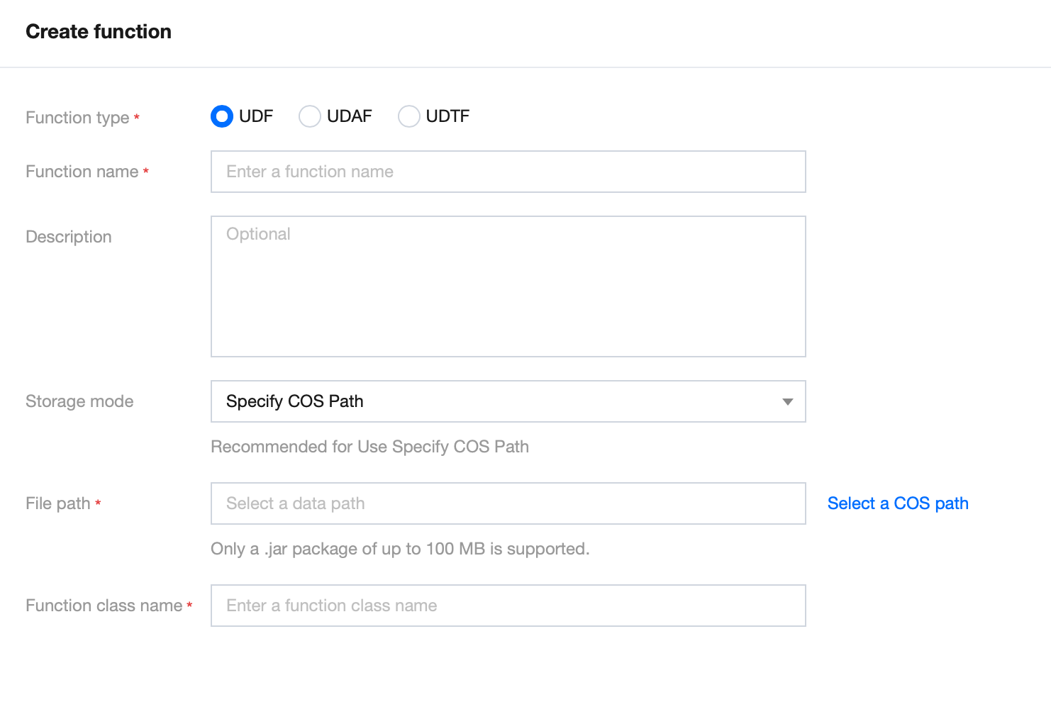 The function package supports either local uploads or the use of existing JAR or Python files stored in COS. For local uploads, the maximum file size for JAR files is 5 MB, and for Python files, the limit is 2 MB.