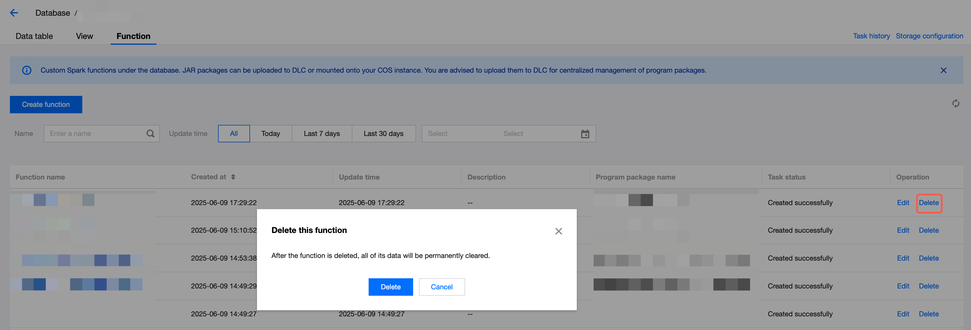 Python UDF registration is effective globally, and the configuration entry is as follows: Navigate to the Data Management page, switch to the Functions tab, and click Create. For the creation and management processes, refer to UDF Function Development Guide. Select the Spark cluster to run the function. There will be no fees incurred during the execution.