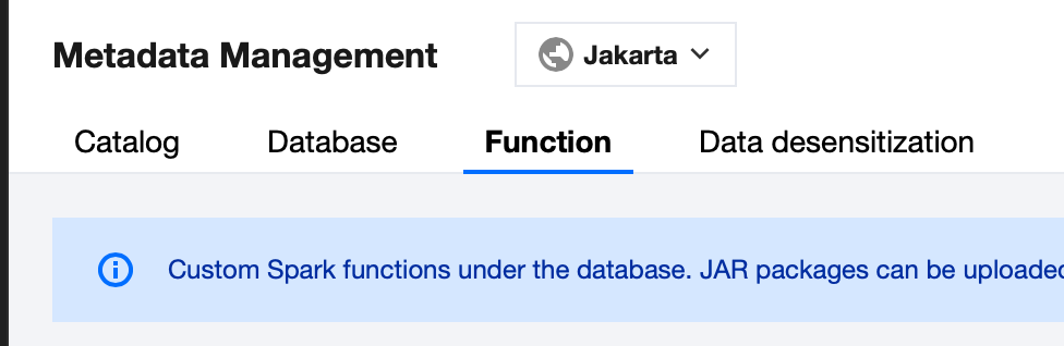 1. Log in to the DLC Console, select the service region. The account must have database operation permissions. 2. Go to the Metadata Management page and click the database name of the function you want to view. 3. Select a Function and click the Edit button to enter the function information editing page.