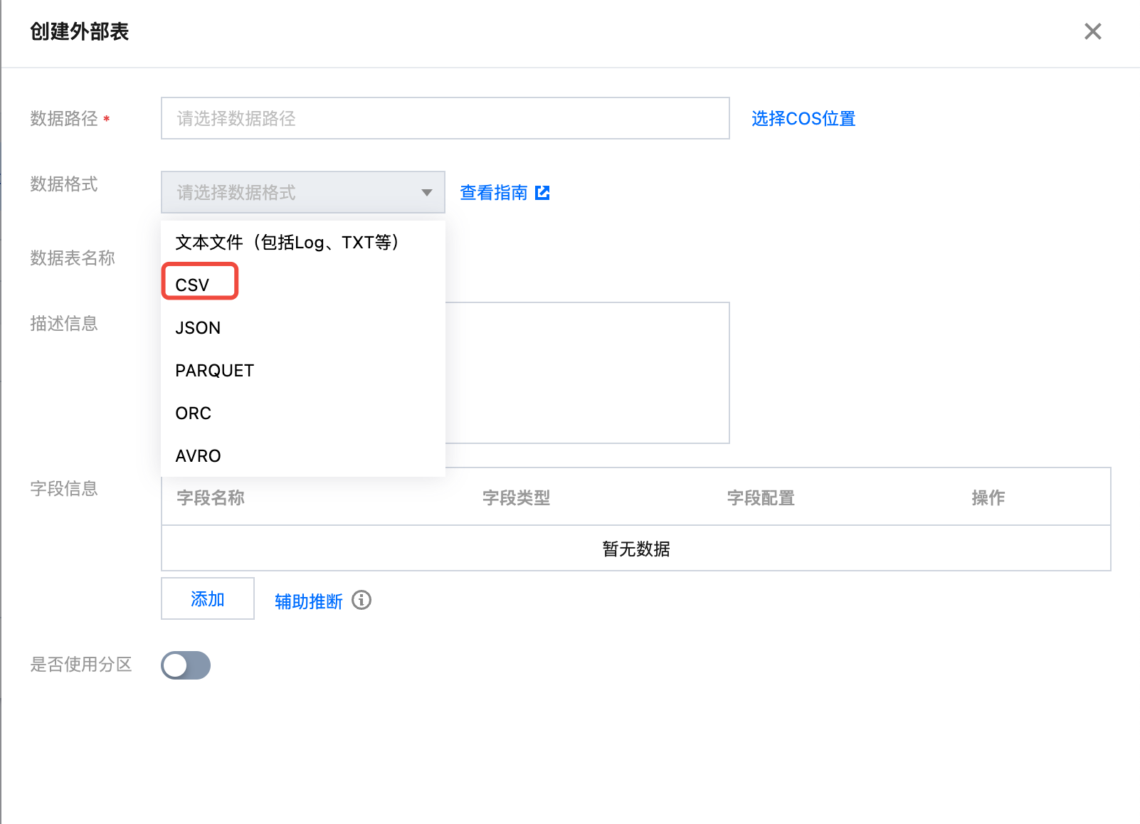 /**LOCATION: 指向对应的 cos 存储目录,其他保持原样*/CREATE EXTERNAL TABLE IF NOT EXISTS dlc_db.avro_demo(`id` int,`name` string)PARTITIONED BY (`dt` string)STORED AS ORC LOCATION 'cosn://your_cos_location'