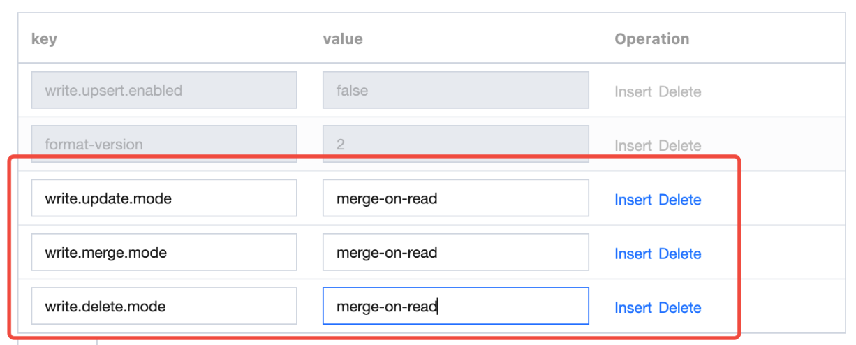 format-version | Iceberg 表版本,取值范围1、2。 标准引擎 Spark Standard-S 1.1、SuperSQL Spark 3.5 默认取值为2,其余场景默认值为1 | 建议配置为2 |