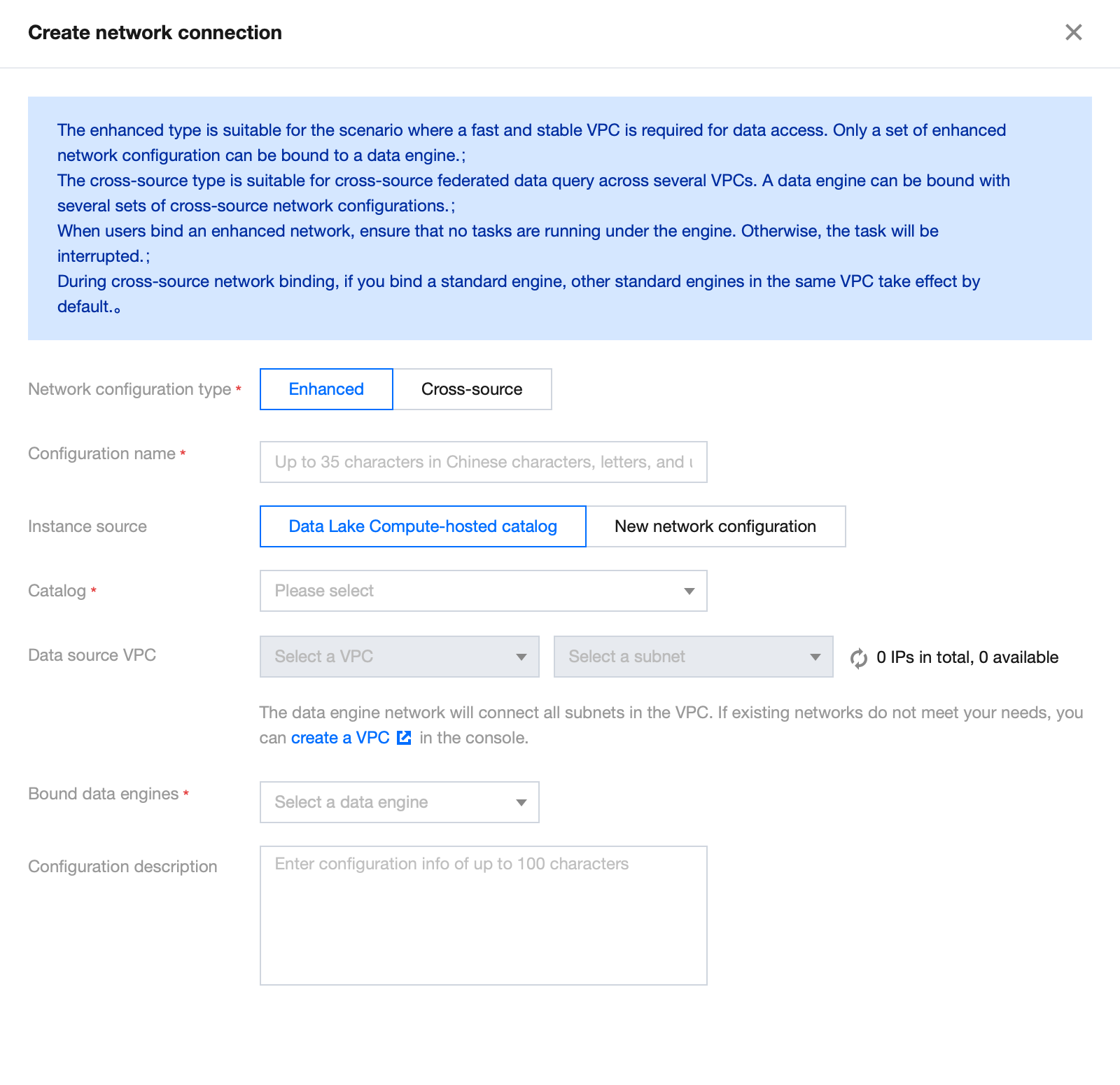 Network Configuration Type | Yes | Select according to the use case Enhanced network configuration: suitable for data scenarios that require high-speed and stable access to a VPC. Cross-origin network configuration: suitable for cross-origin federated query analysis scenarios that need to access data under multiple VPCs. |