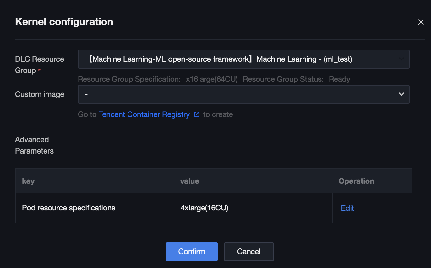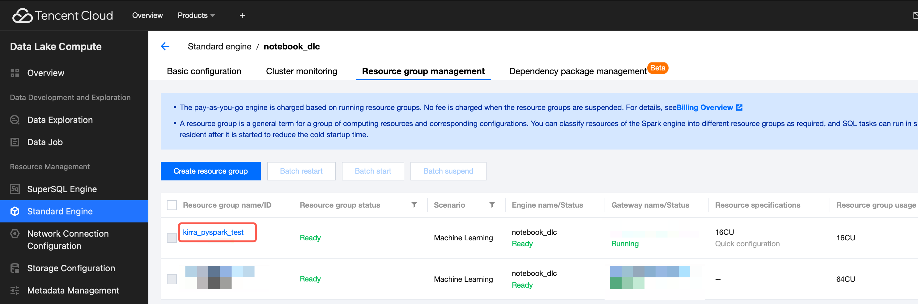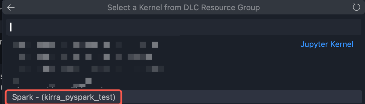 For example, the resource group named "Spark - (kirra_pyspark_test)" selected in the above figure is consistent with the resource group name in the DLC data engine: