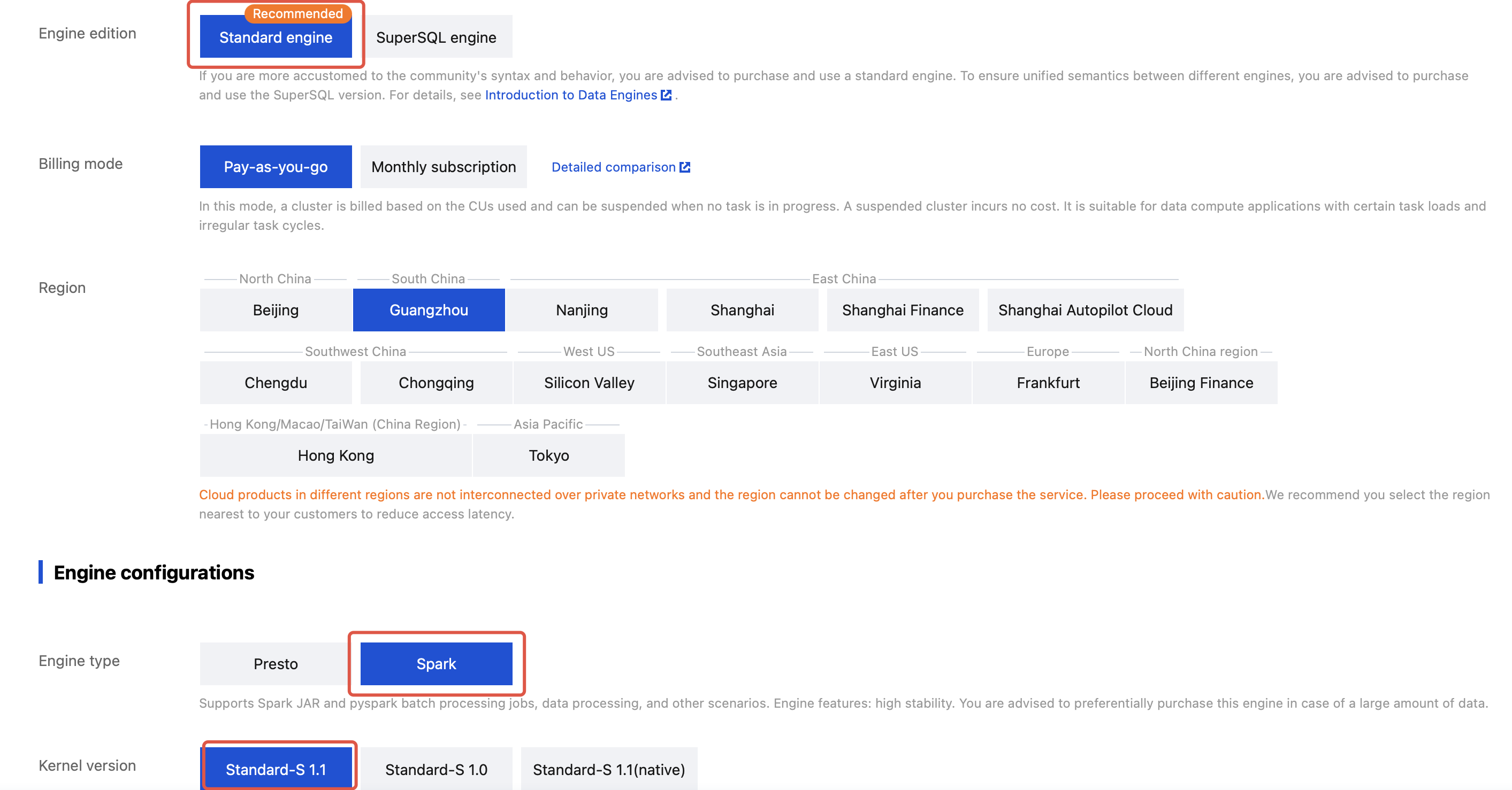3. Purchase Standard Engine-spark, and select the kernel version: Standard-S 1.1.