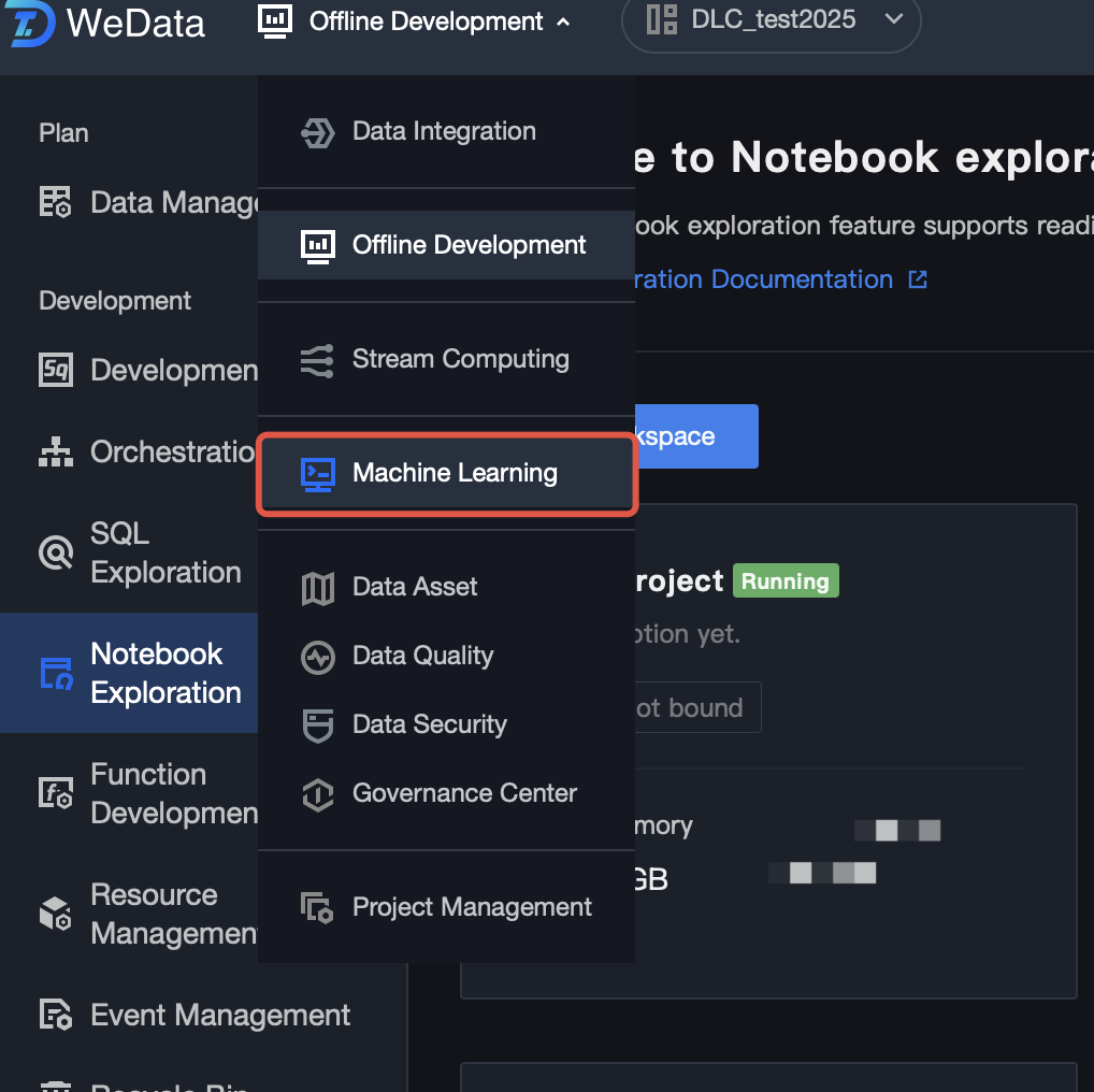 Currently, the DLC machine learning resource group, WeData Notebook exploration, and machine learning are all allowlisted features. If needed, submit a ticket to contact the DLC and WeData teams to enable the machine learning resource group, Notebook, and MLflow services. Activating Accounts and Products