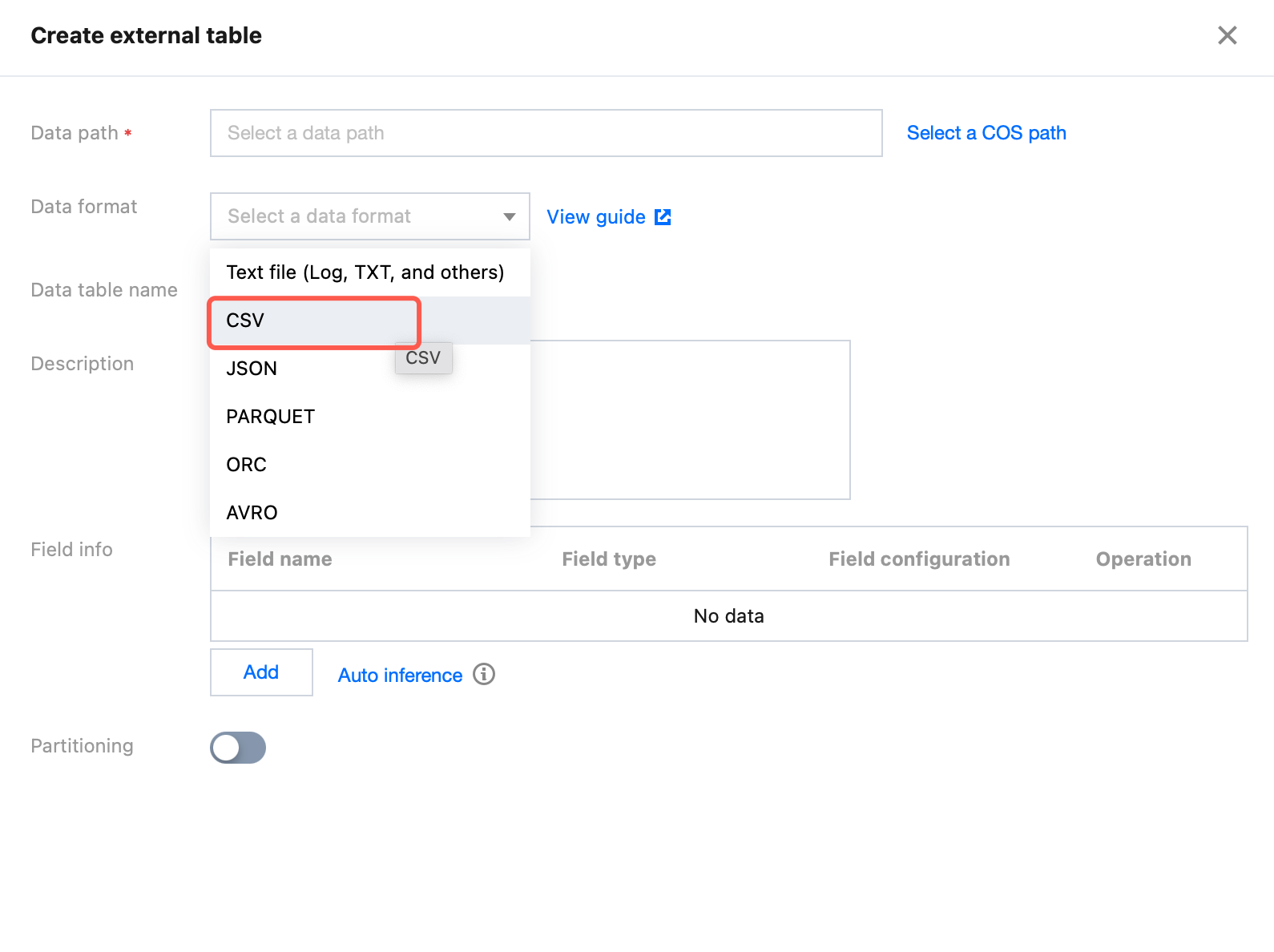8. Select the data format as CSV and configure related options.