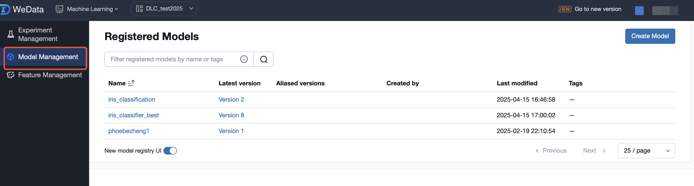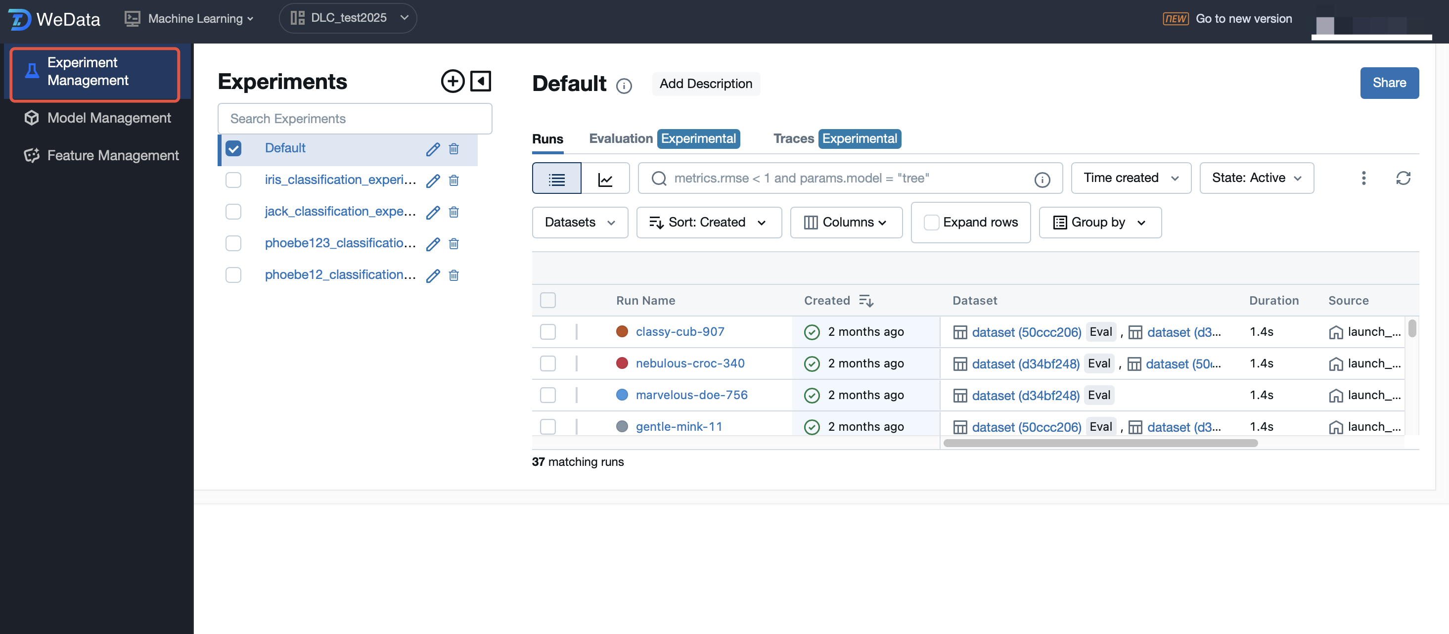 After the resource group and demo dataset are created, go to WeData to practice model training using Notebook and MLflow.