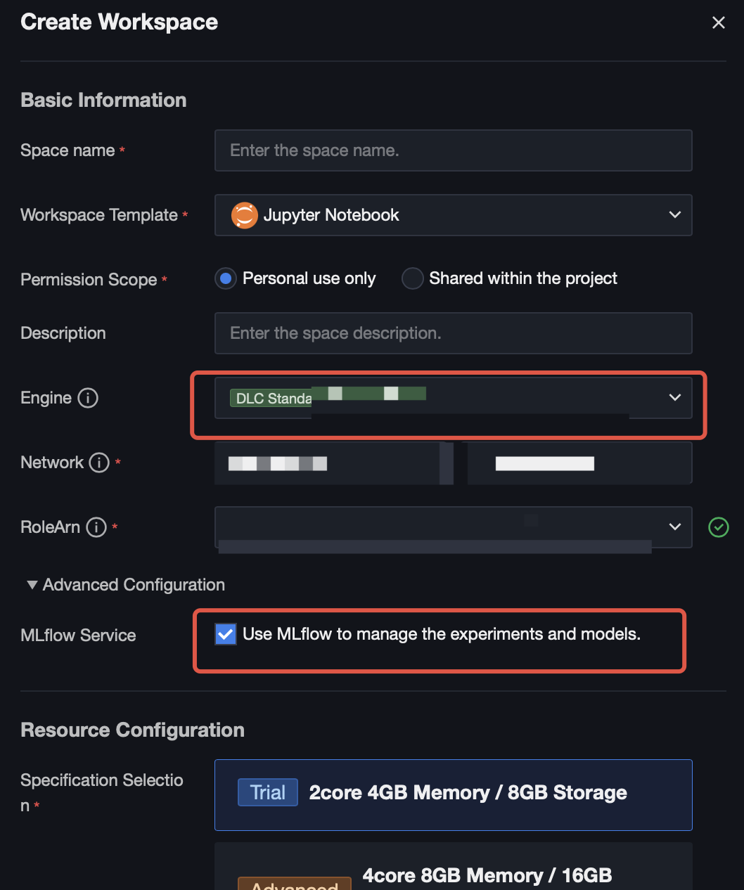 MLflow Service | Use MLflow to manage experiments and models, which is not selected by default. After selecting, the creation of experiments and machine learning using MLflow functions in Notebook tasks will be reported to the MLflow service deployed in Standard-S 1.1. You can later view them in Machine Learning > Experiment Management and Model Management. |