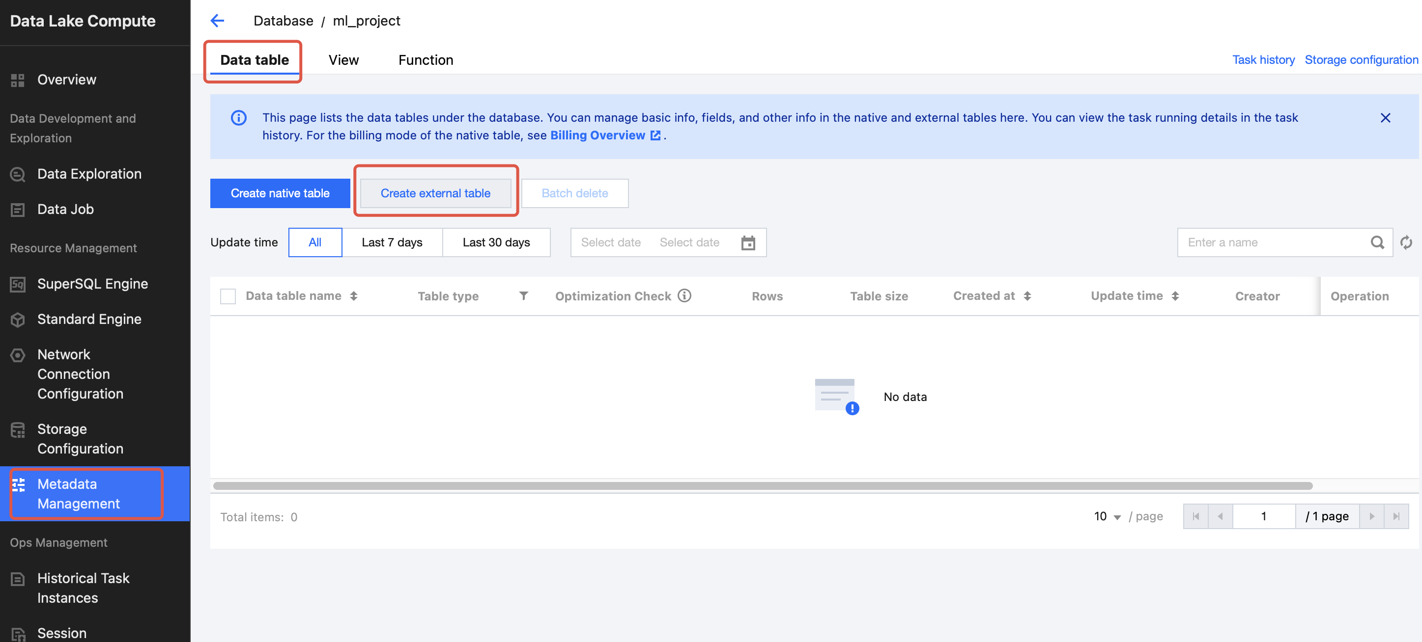 2. Log in to COS, select a bucket, and upload the dataset. 3. After the upload is completed, go to Metadata Management, click Create Data Catalog, or use an existing data catalog to upload an external table. 5. Click to create a database named: database_testnotebook.
