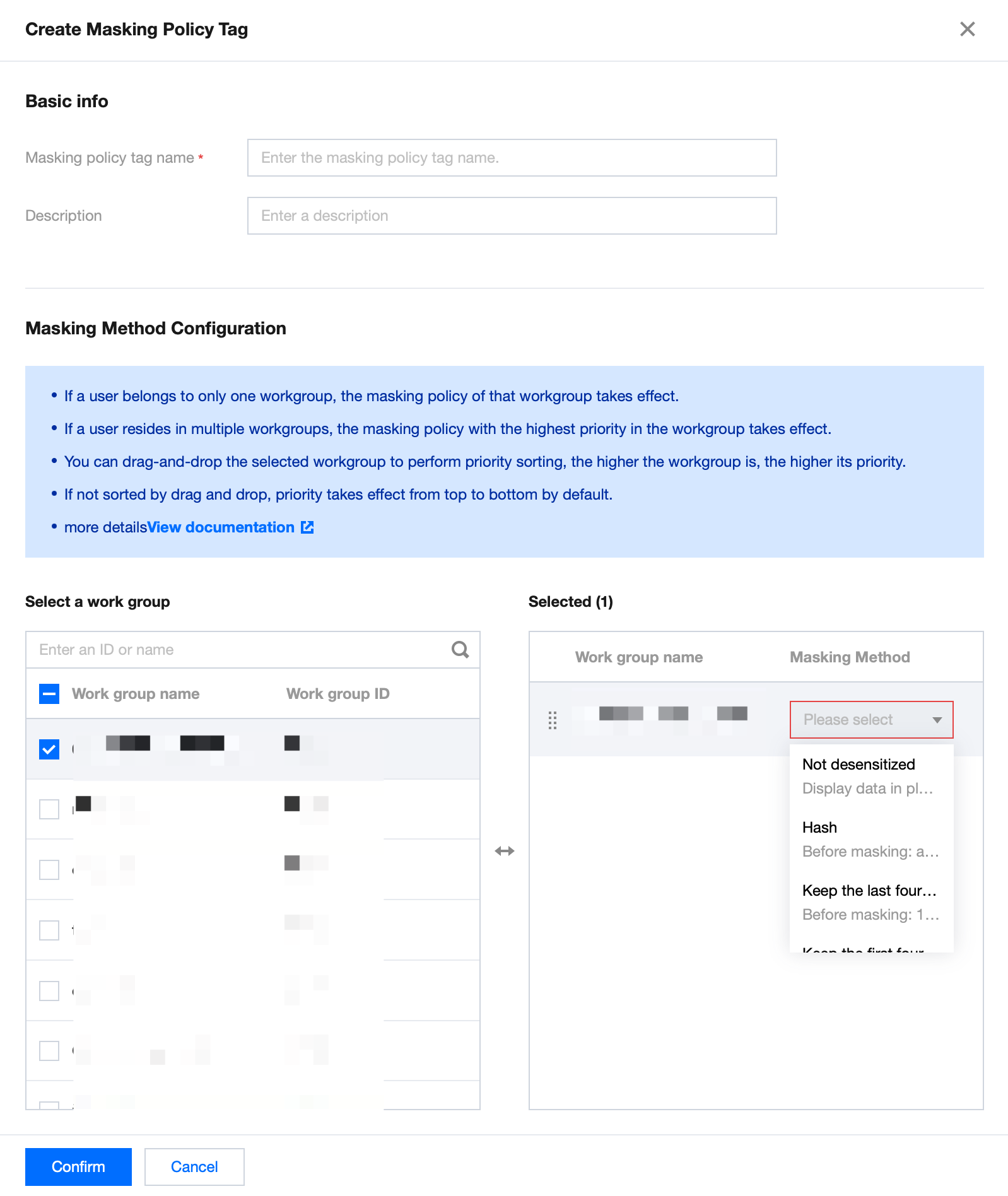 1. Go to the DLC console, choose Metadata Management > Data Desensitization, click Create Masking Policy Tag, and create a masking policy tag in the pop-up dialog box. 2. In Configure Masking Method, select the corresponding working groups to add them to the Selected dialog box, and configure a masking method for each working group.