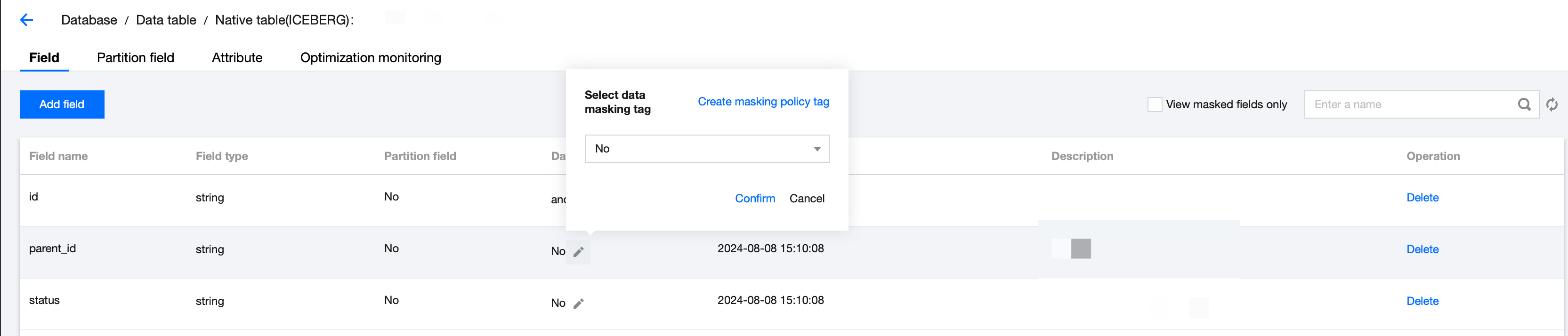 2. Locate the field requiring desensitization, or search for the field name in the top-right search box. Then, in the Masking Policy Tag column for that field, click , and select the desired masking policy tag for binding from the dialog box. 3. If no matching masking policy tag is found, click Create Masking Policy Tag in the dialog box to quickly create one.