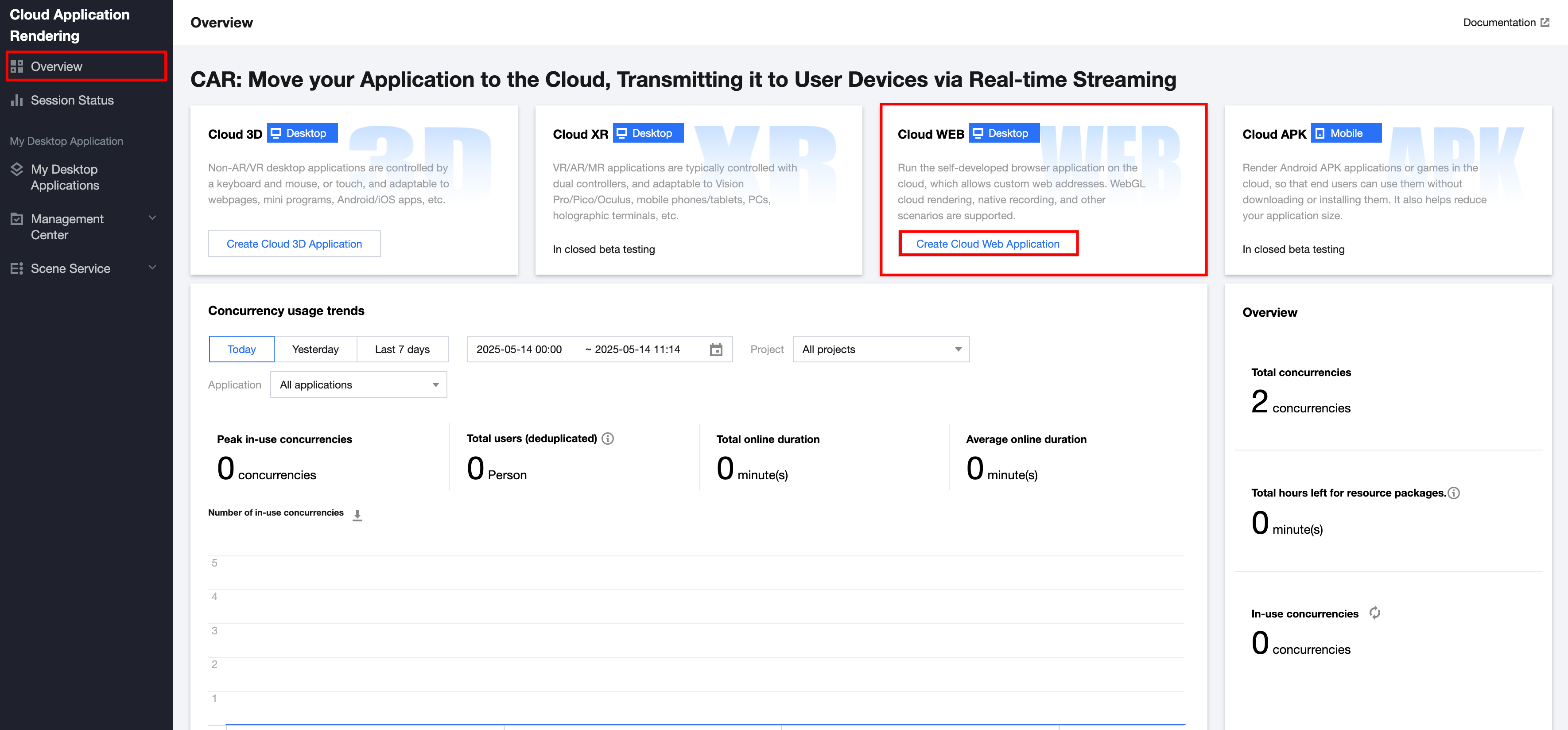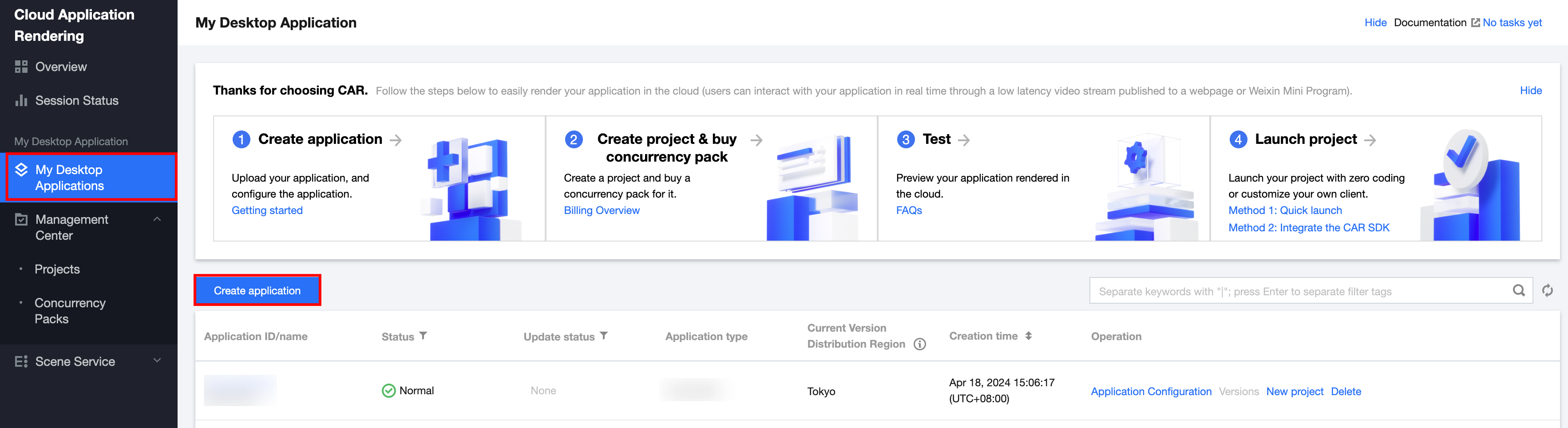 1. In the CAR console, go to the Overview page, select the cloud WEB interface, and click Create Cloud Web Application. As shown below: Alternatively, go to the My Desktop Application page in the console and click Create application, as shown below: