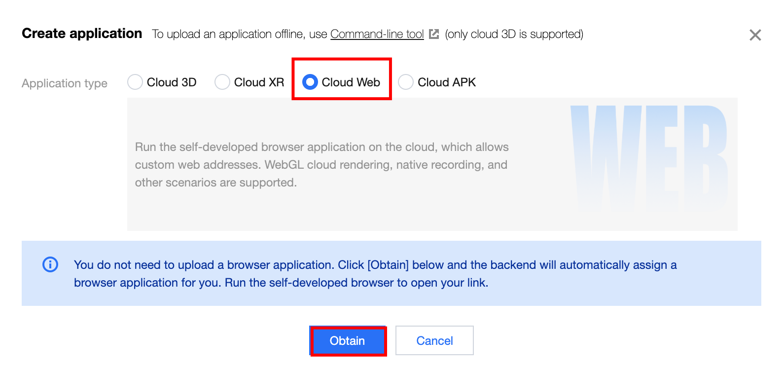 2. A pop-up application window will appear. Select Cloud Web as the application type, click Obtain, and then you can obtain the assigned cloud browser application. As shown below: