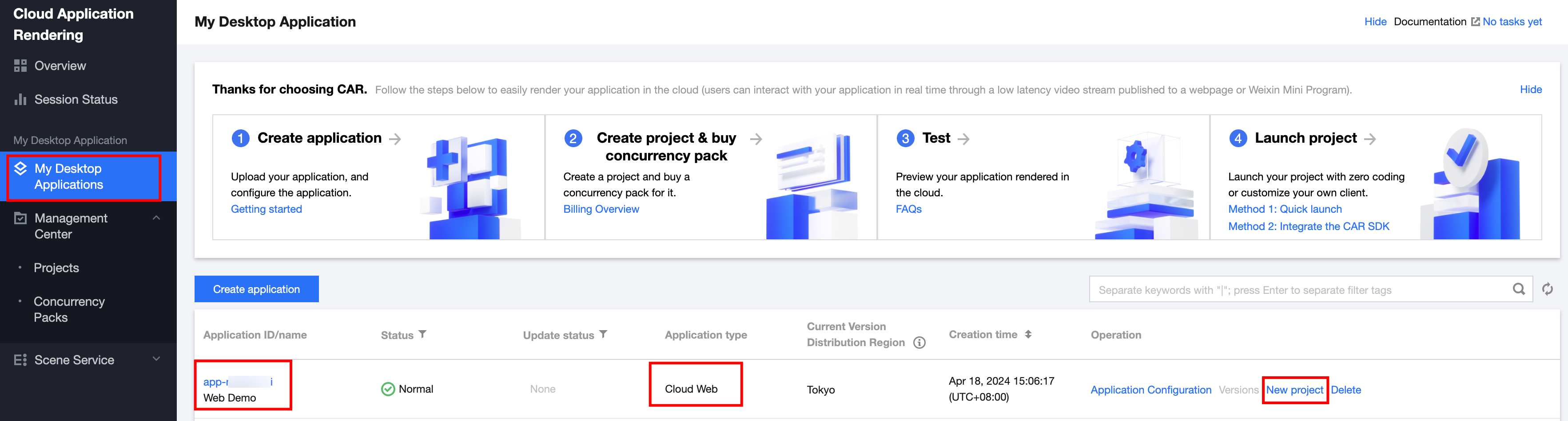 1. On the CAR Console > My Desktop Applications page, select the recently obtained cloud Web application and click New Project at the operation section, as shown below: Or enter Management Center > Projects page on the console and click Create project. As shown below: