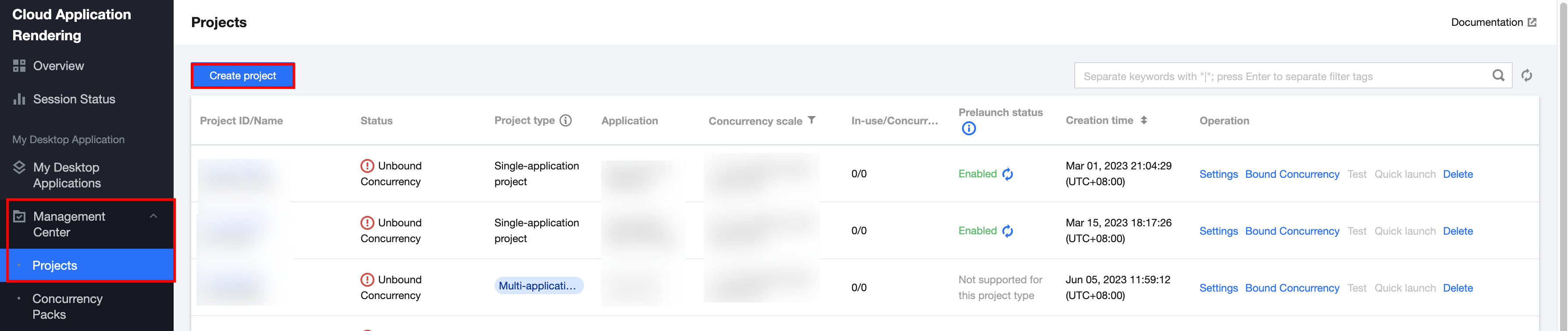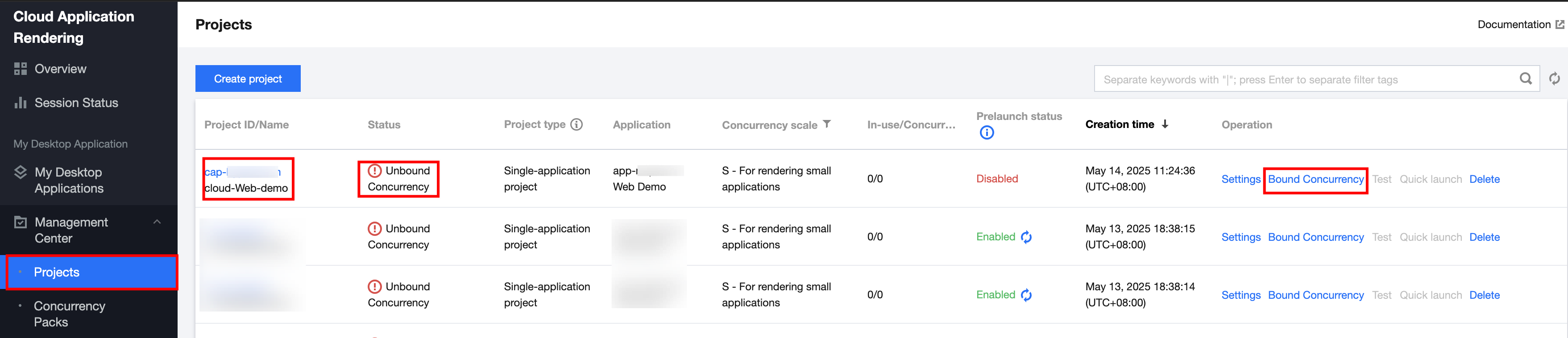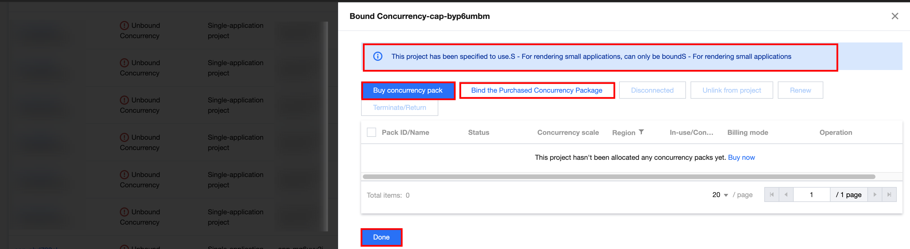 1. On the CAR Console > Projects page, select the project you just created and click Bound Concurrency at the operation section, as shown below. 2. In the pop-up concurrency binding interface, perform concurrency binding settings. Bind the concurrency package according to the concurrency specification settings when creating the project just now. Click Buy Concurrency Pack or Bind Purchased the Concurrency Package. For example, the sample account has purchased an 8-core CPU type - cloud rendering concurrency. Therefore, click Bind the Purchased Concurrency Package. As shown below: