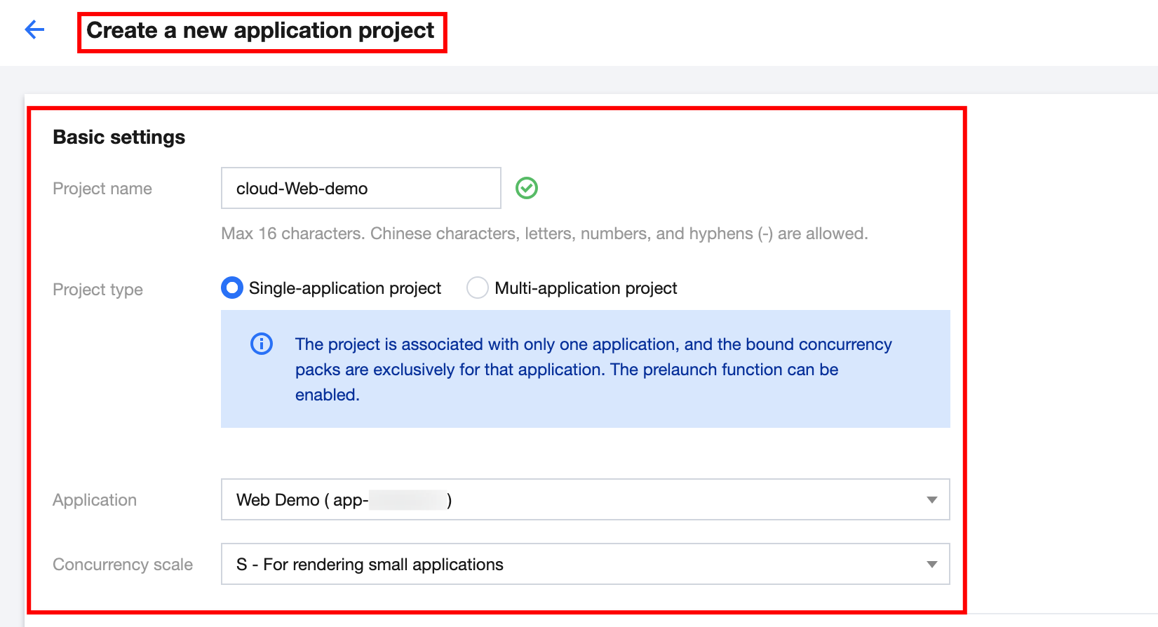 2. Complete basic settings on the application project creation page.