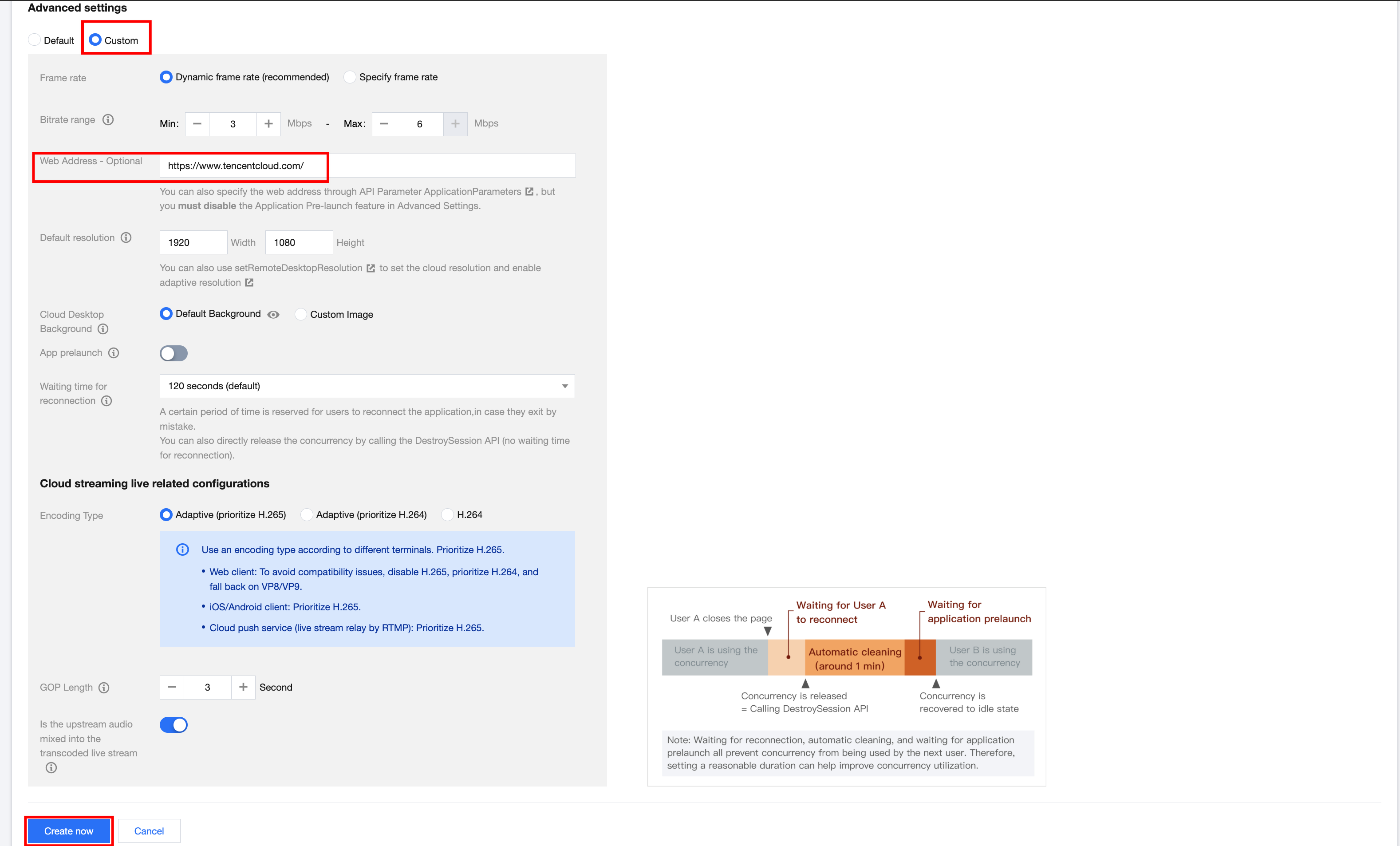 3. According to needs, select Custom in Advanced Settings. Fill in the web address you want to log in to at the web address field. This document takes the Tencent Cloud address as an example (https://tencentcloud.com/). After filling in the web address, click Create Now.